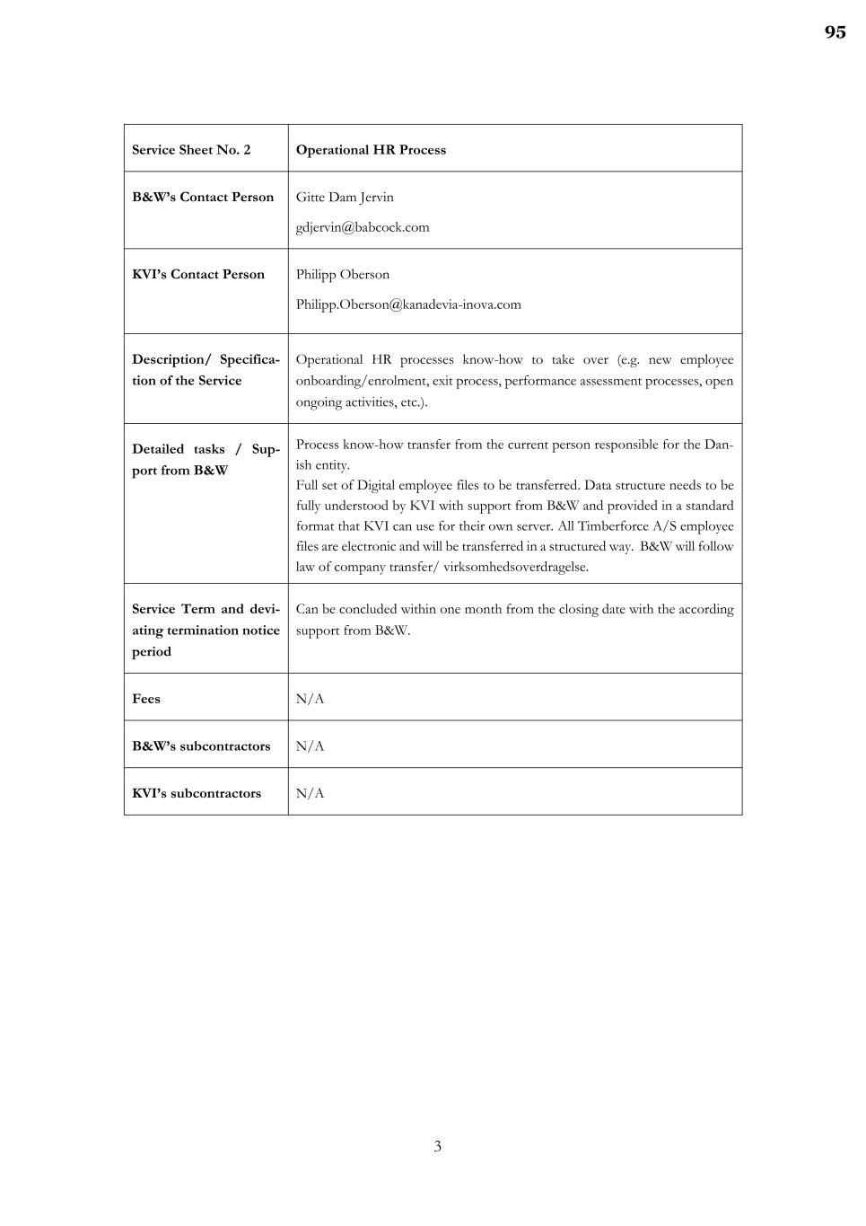 3 Service Sheet No. 2 Operational HR Process B&W’s Contact Person Gitte Dam Jervin gdjervin@babcock.com KVI’s Contact Person Philipp Oberson Philipp.Oberson@kanadevia-inova.com Description/ Specifica- tion of the Service Operational HR processes know-how to take over (e.g. new employee onboarding/enrolment, exit process, performance assessment processes, open ongoing activities, etc.). Detailed tasks / Sup- port from B&W Process know-how transfer from the current person responsible for the Dan- ish entity. Full set of Digital employee files to be transferred. Data structure needs to be fully understood by KVI with support from B&W and provided in a standard format that KVI can use for their own server. All Timberforce A/S employee files are electronic and will be transferred in a structured way. B&W will follow law of company transfer/ virksomhedsoverdragelse. Service Term and devi- ating termination notice period Can be concluded within one month from the closing date with the according support from B&W. Fees N/A B&W’s subcontractors N/A KVI’s subcontractors N/A 95