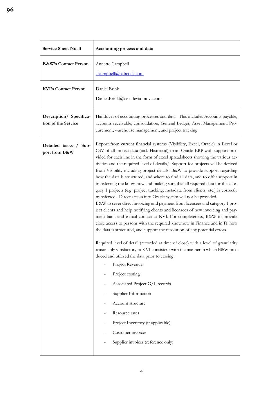 4 Service Sheet No. 3 Accounting process and data B&W’s Contact Person Annette Campbell alcampbell@babcock.com KVI’s Contact Person Daniel Brink Daniel.Brink@kanadevia-inova.com Description/ Specifica- tion of the Service Handover of accounting processes and data. This includes Accounts payable, accounts receivable, consolidation, General Ledger, Asset Management, Pro- curement, warehouse management, and project tracking Detailed tasks / Sup- port from B&W Export from current financial systems (Visibility, Excel, Oracle) in Excel or CSV of all project data (incl. Historical) to an Oracle ERP with support pro- vided for each line in the form of excel spreadsheets showing the various ac- tivities and the required level of details/. Support for projects will be derived from Visibility including project details. B&W to provide support regarding how the data is structured, and where to find all data, and to offer support in transferring the know-how and making sure that all required data for the cate- gory 1 projects (e.g. project tracking, metadata from clients, etc.) is correctly transferred. Direct access into Oracle system will not be provided. B&W to sever direct invoicing and payment from licensees and category 1 pro- ject clients and help notifying clients and licensees of new invoicing and pay- ment bank and e-mail contact at KVI. For completeness, B&W to provide close access to persons with the required knowhow in Finance and in IT how the data is structured, and support the resolution of any potential errors. Required level of detail (recorded at time of close) with a level of granularity reasonably satisfactory to KVI consistent with the manner in which B&W pro- duced and utilized the data prior to closing: - Project Revenue - Project costing - Associated Project G/L records - Supplier Information - Account structure - Resource rates - Project Inventory (if applicable) - Customer invoices - Supplier invoices (reference only) 96