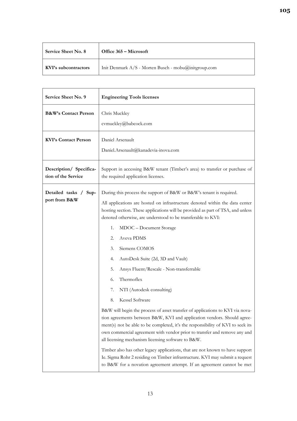 10 Service Sheet No. 7 Data Center Hosting, Global Connect (hosting contract managed by Lean-on, managed by Init Denmark A/S)includes Citrix Managed ser- vices. B&W’s Contact Person Chris Muckley cvmuckley@babcock.com KVI’s Contact Person Daniel Arsenault Daniel.Arsenault@kanadevia-inova.com Description/ Specifica- tion of the Service Hosting of 79 servers incl. Active Directory, File servers Detailed tasks / Sup- port from B&W Support in accessing B&W data center (Timber’s area) to get the relevant data needed to migrated to new temporary domain and data center. Service Term and devi- ating termination notice period Services to be provided until a KVI – Init contract is in place. We estimate 6- 7 months to achieve this, if required, this can be extended up to three additional months. Data Center hosting is provided by Lean-On and part of the Lean-on contract. Presuming a novation agreement between B&W, KVI and Lean-on can come into place, the host of such services would be immediately picked up by KVI and thus removed from TSA Fees. It can be presumed an Init managed services contract may also be picked up from Service Desk support and Servers and Storage. Once a B&W, KVI and Init novation agreement is within place, the TSA costs would drop the cost of this service. Upon contract novation and transfer to KVI Init group will lose access to B&W Azure storage required for backups, and B&W owned systems not spe- cific to the Timber migration. B&W agrees to provide the current Domain of servers in its state, while provid- ing Windows patching for applicable servers, networking, backup and restore and cybersecurity services congruent to what is used today. B&W makes no warranties or guarantees that technical and/or cybersecurity incidents will not happen, but will use commercially, reasonable methods to prevent, respond and retore servers and infrastructure to expected state. KVI, may not unrea- sonably prevent B&W from performing maintenance, inspections, logging or other standard infrastructure maintenance tasks while its servers and infra- structure reside on its network and domain. 102