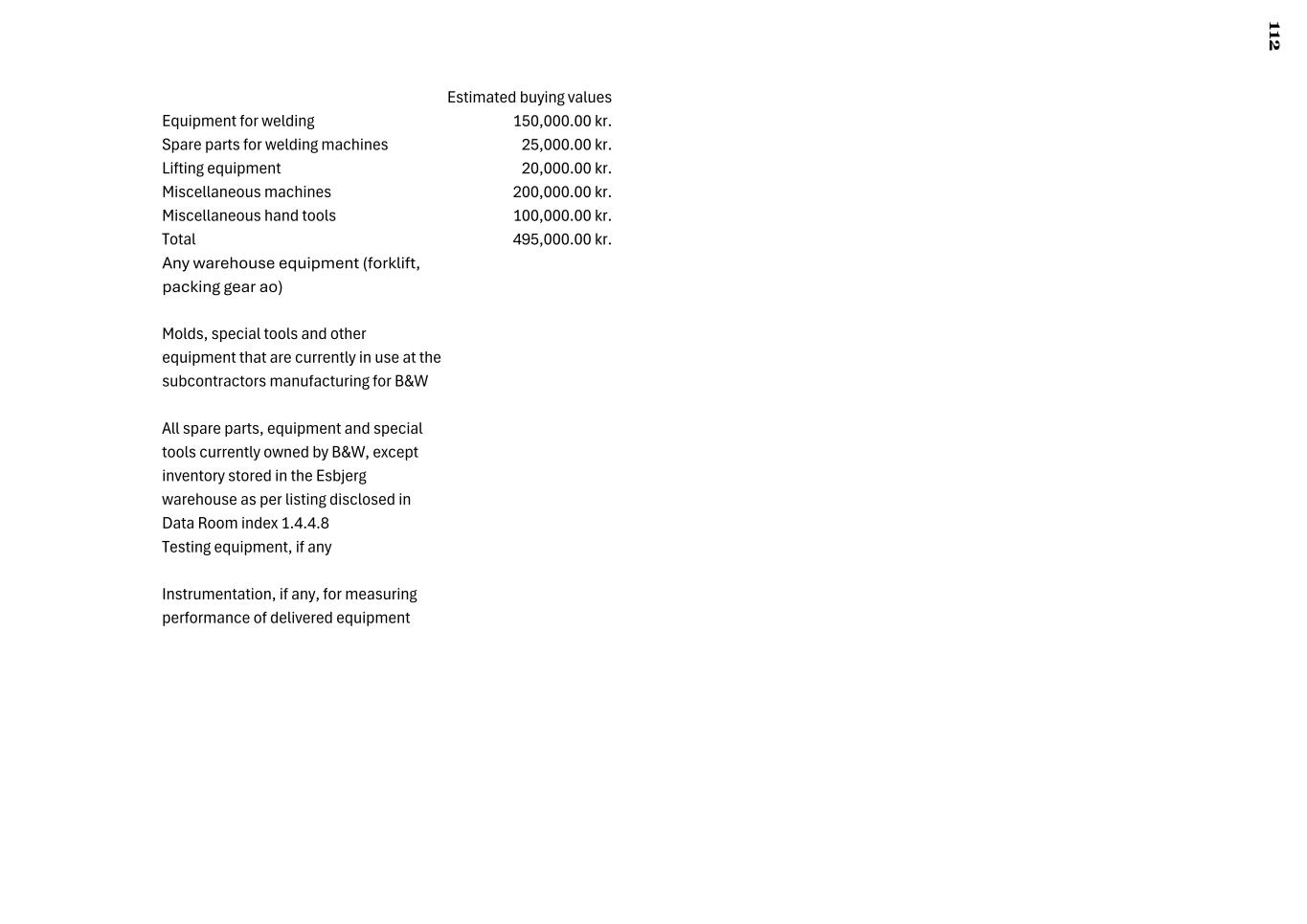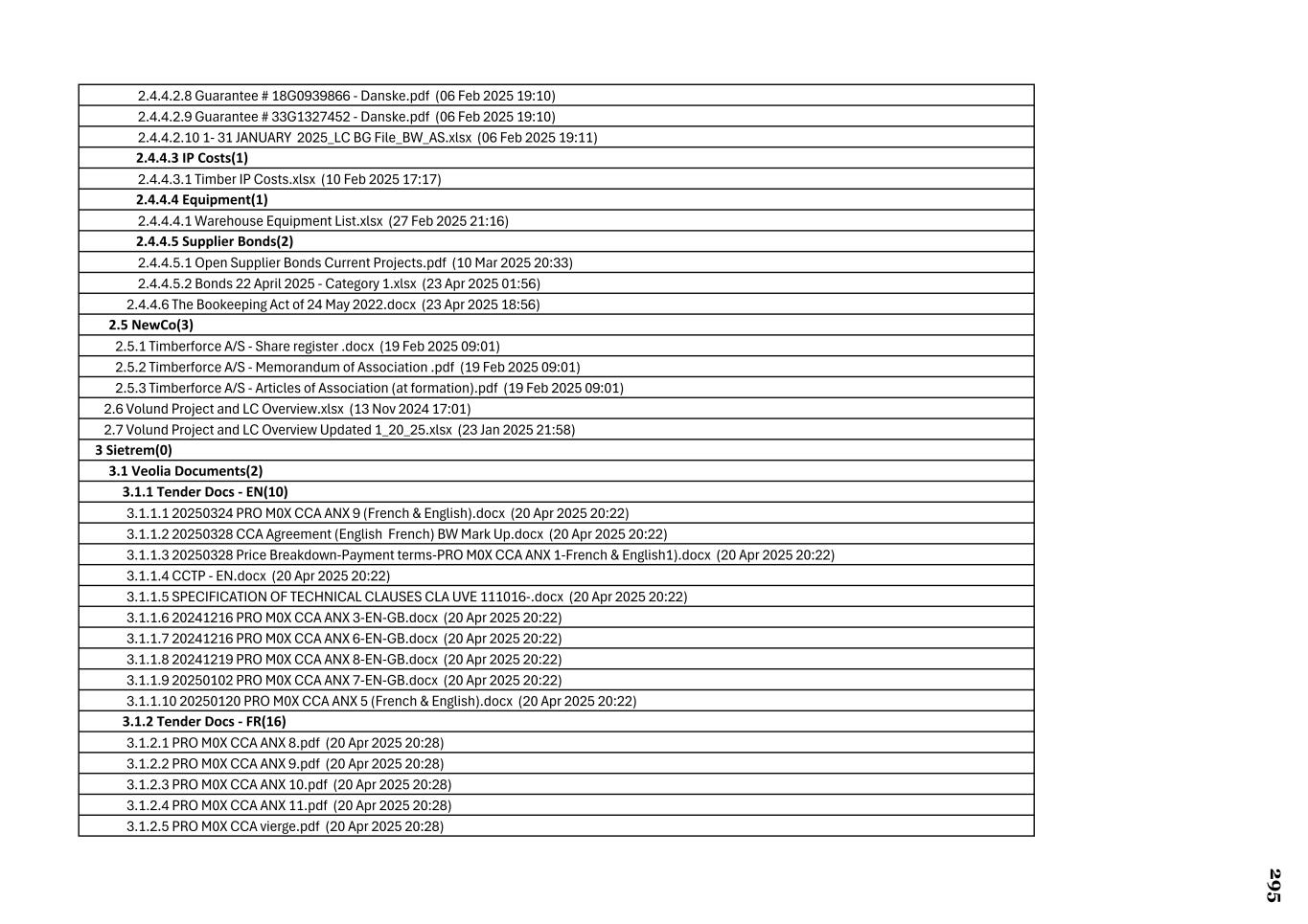 2.4.4.2.8 Guarantee # 18G0939866 - Danske.pdf (06 Feb 2025 19:10) 2.4.4.2.9 Guarantee # 33G1327452 - Danske.pdf (06 Feb 2025 19:10) 2.4.4.2.10 1- 31 JANUARY 2025_LC BG File_BW_AS.xlsx (06 Feb 2025 19:11) 2.4.4.3 IP Costs(1) 2.4.4.3.1 Timber IP Costs.xlsx (10 Feb 2025 17:17) 2.4.4.4 Equipment(1) 2.4.4.4.1 Warehouse Equipment List.xlsx (27 Feb 2025 21:16) 2.4.4.5 Supplier Bonds(2) 2.4.4.5.1 Open Supplier Bonds Current Projects.pdf (10 Mar 2025 20:33) 2.4.4.5.2 Bonds 22 April 2025 - Category 1.xlsx (23 Apr 2025 01:56) 2.4.4.6 The Bookeeping Act of 24 May 2022.docx (23 Apr 2025 18:56) 2.5 NewCo(3) 2.5.1 Timberforce A/S - Share register .docx (19 Feb 2025 09:01) 2.5.2 Timberforce A/S - Memorandum of Association .pdf (19 Feb 2025 09:01) 2.5.3 Timberforce A/S - Articles of Association (at formation).pdf (19 Feb 2025 09:01) 2.6 Volund Project and LC Overview.xlsx (13 Nov 2024 17:01) 2.7 Volund Project and LC Overview Updated 1_20_25.xlsx (23 Jan 2025 21:58) 3 Sietrem(0) 3.1 Veolia Documents(2) 3.1.1 Tender Docs - EN(10) 3.1.1.1 20250324 PRO M0X CCA ANX 9 (French & English).docx (20 Apr 2025 20:22) 3.1.1.2 20250328 CCA Agreement (English French) BW Mark Up.docx (20 Apr 2025 20:22) 3.1.1.3 20250328 Price Breakdown-Payment terms-PRO M0X CCA ANX 1-French & English1).docx (20 Apr 2025 20:22) 3.1.1.4 CCTP - EN.docx (20 Apr 2025 20:22) 3.1.1.5 SPECIFICATION OF TECHNICAL CLAUSES CLA UVE 111016-.docx (20 Apr 2025 20:22) 3.1.1.6 20241216 PRO M0X CCA ANX 3-EN-GB.docx (20 Apr 2025 20:22) 3.1.1.7 20241216 PRO M0X CCA ANX 6-EN-GB.docx (20 Apr 2025 20:22) 3.1.1.8 20241219 PRO M0X CCA ANX 8-EN-GB.docx (20 Apr 2025 20:22) 3.1.1.9 20250102 PRO M0X CCA ANX 7-EN-GB.docx (20 Apr 2025 20:22) 3.1.1.10 20250120 PRO M0X CCA ANX 5 (French & English).docx (20 Apr 2025 20:22) 3.1.2 Tender Docs - FR(16) 3.1.2.1 PRO M0X CCA ANX 8.pdf (20 Apr 2025 20:28) 3.1.2.2 PRO M0X CCA ANX 9.pdf (20 Apr 2025 20:28) 3.1.2.3 PRO M0X CCA ANX 10.pdf (20 Apr 2025 20:28) 3.1.2.4 PRO M0X CCA ANX 11.pdf (20 Apr 2025 20:28) 3.1.2.5 PRO M0X CCA vierge.pdf (20 Apr 2025 20:28) 2 9 5