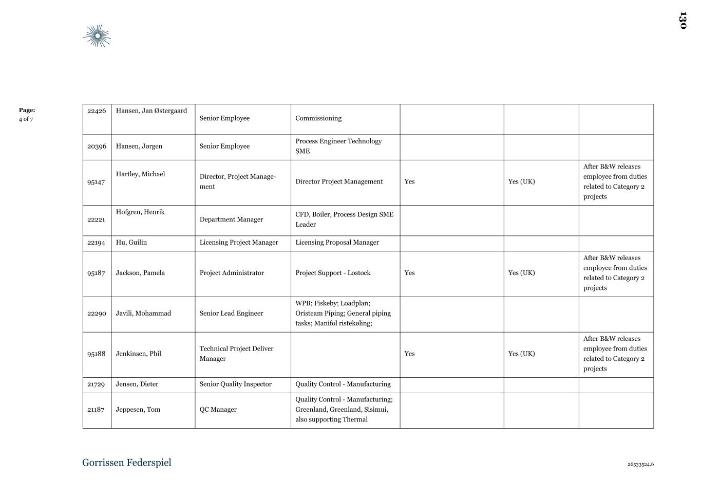 1.4.2.3.1 F834650.docx (05 Feb 2025 20:53) 1.4.2.3.2 F834648.docx (05 Feb 2025 20:53) 1.4.2.3.3 F834649.docx (05 Feb 2025 20:53) 1.4.2.4 Multi-Lane DynaGrate(1) 1.4.2.4.1 Technical Q&A #18.pdf (13 Feb 2025 20:30) 1.4.3 HR(0) 1.4.3.1 Incentive Schemes(2) 1.4.3.1.1 2023 AIP Summary.pdf (17 Jan 2025 22:21) 1.4.3.1.2 2020 SIP Plan Final Doc.pdf (17 Jan 2025 22:21) 1.4.3.2 Standard Employment Contracts(4) 1.4.3.2.1 UK(4) 1.4.3.2.1.1 UK Contract - Standard template -FIXED TERM employees.pdf (27 Jan 2025 17:54) 1.4.3.2.1.2 UK Template (JH) Non Solicitation and non Compete Agreement.pdf (27 Jan 2025 17:54) 1.4.3.2.1.3 UK Contract - standard template - mgt only.pdf (27 Jan 2025 17:54) 1.4.3.2.1.4 UK Contract - Standard template -all employees.pdf (27 Jan 2025 17:54) 1.4.3.2.2 Template MD contract.pdf (17 Jan 2025 22:22) 1.4.3.2.3 Template employee contract.pdf (17 Jan 2025 22:22) 1.4.3.2.4 Template secondment contract.pdf (31 Jan 2025 19:52) 1.4.3.2.5 Master Seniorsamarbejdsaftale engelsk.pdf (05 Mar 2025 03:21) 1.4.3.3 Pension(1) 1.4.3.3.1 Pension, health insurance and accident insurance.pdf (17 Jan 2025 22:22) 1.4.3.4 Collective Labor Agreements(1) 1.4.3.4.1 IFO 2023-2025 EN.pdf (17 Jan 2025 22:23) 1.4.3.5 Employee Listings(4) 1.4.3.5.1 DK & UK Overview employees anonymized.xlsx (21 Jan 2025 17:20) 1.4.3.5.2 Project Timber EE List Redacted 1.14.25 with Function.xlsx (21 Jan 2025 17:20) 1.4.3.5.3 DK UK Overview employees anonymized incl protection.xlsx (12 Mar 2025 23:09) 1.4.3.5.4 DK UK Overview employees anonymized incl protection 03-20-2025.xlsx (20 Mar 2025 18:59) 1.4.3.6 Resource Demand(1) 1.4.3.6.1 Backlog Projects Resource Loading.pdf (03 Feb 2025 15:44) 1.4.4 Financial(0) 1.4.4.1 Revenue by Country(2) 1.4.4.1.1 B&W (Volund) AS - RevByCountry2023.xlsx (17 Jan 2025 23:03) 1.4.4.1.2 B&W (Volund) AS - RevByCountry2022 & 2021.xlsx (17 Jan 2025 23:03) 1.4.4.2 Project Status Reports & Financials(2) 1.4.4.2.1 Executive Summaries(10) 2 8 8
