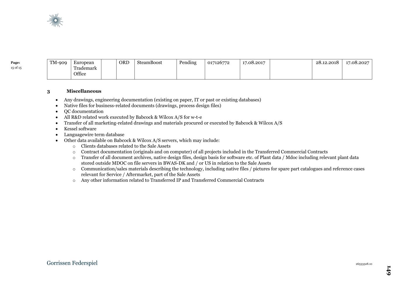 1.4.4.5.5 403G LICENSE AGRMT PSR- DEC. 2024.xls (29 Jan 2025 23:38) 1.4.4.5.6 403J_Greenland Sisimiut Nuuk_2024 12.xls (29 Jan 2025 23:38) 1.4.4.5.7 403K_Maha Sarakham_2024 12.xls (29 Jan 2025 23:38) 1.4.4.5.8 390K_Oristeam_202412.xls (29 Jan 2025 23:38) 1.4.4.5.9 390Z-391Z-392R_Jiangyin PSR_202412 UPDATED r2.xls (29 Jan 2025 23:38) 1.4.4.5.10 402Z_DOMBASLE_2024 12.xls (29 Jan 2025 23:38) 1.4.4.6 Hourly Rates(1) 1.4.4.6.1 PR-09.15.04 timesatser 2021-2022_EN v1.docx (10 Feb 2025 17:43) 1.4.4.7 BWAS Purchase Orders(6) 1.4.4.7.1 B&W AS Purchase Orders 2.6.25.xlsx (10 Feb 2025 21:35) 1.4.4.7.2 1544 Open Orders as of 2-28-2025.xlsx (10 Mar 2025 20:32) 1.4.4.7.3 DKX364886_00.pdf (23 Apr 2025 01:58) 1.4.4.7.4 DKX368141_UP.pdf (23 Apr 2025 02:55) 1.4.4.7.5 Appendix 02 Babcock and Wilcox Volund T&C April 2020.pdf (23 Apr 2025 02:56) 1.4.4.7.6 1544 Open Orders as of 4-22-2025 Cat. 1 Only.xlsx (23 Apr 2025 21:04) 1.4.4.8 Inventory(1) 1.4.4.8.1 Volund Manual cycle count 2025 - BK Update.xlsx (20 Feb 2025 18:34) 1.4.4.9 Warranty(1) 1.4.4.9.1 20. Q2-May-2024 - Analysis of Adequacy of Warranty Reserve.xlsx (27 Feb 2025 20:23) 1.4.4.10 Legacy projects(2) 1.4.4.10.1 Lostock Forecast.xlsx (27 Feb 2025 21:04) 1.4.4.10.2 Kelvin Denmark Support - 2025.March - ETC.xlsx (15 Mar 2025 02:56) 1.4.4.11 Licensing Revenue(0) 2 General Dataroom(2) 2.1 Technology(6) 2.1.1 BWVA_IP_Patents.pdf (13 Nov 2024 15:49) 2.1.2 BWVA_IP_Trademarks_and_Domain_Names.pdf (13 Nov 2024 15:49) 2.1.3 Grate Technology Presentation.pdf (13 Nov 2024 15:49) 2.1.4 WtE Reference List.pdf (13 Nov 2024 15:49) 2.1.5 DynaGrate W2E Technology v2.pdf (29 Jan 2025 22:41) 2.1.6 Agreement of Trademark Rights BWV.pdf (14 Mar 2025 01:37) 2.2 B&W Solar(1) 2.2.1 B&W Solar - 8.15.2024 FMV - RSM Draft Schedules - 9.11.2024.pdf (13 Nov 2024 16:15) 2.3 Leases(3) 2.3.1 Lejekontrakt - 3056L John Tranums Vej 23 - underskrevet af alle.pdf (05 Dec 2024 15:32) 2.3.2 Underskrevet lejekontrakt,Tåstrup 21.03.2022.pdf (05 Dec 2024 15:32) 2 9 1