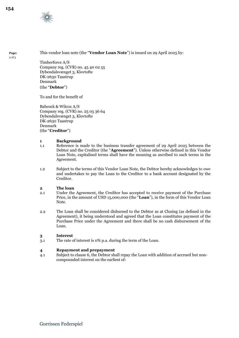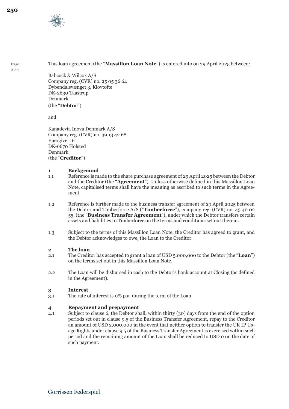 Page: 2 of 6 This loan agreement (the “Massillon Loan Note”) is entered into on 29 April 2025 between: Babcock & Wilcox A/S Company reg. (CVR) no. 25 05 36 64 Dybendalsvænget 3, Klovtofte DK-2630 Taastrup Denmark (the “Debtor”) and Kanadevia Inova Denmark A/S Company reg. (CVR) no. 39 13 42 68 Energivej 16 DK-6670 Holsted Denmark (the “Creditor”) 1 Background 1.1 Reference is made to the share purchase agreement of 29 April 2025 between the Debtor and the Creditor (the “Agreement”). Unless otherwise defined in this Massillon Loan Note, capitalised terms shall have the meaning as ascribed to such terms in the Agree- ment. 1.2 Reference is further made to the business transfer agreement of 29 April 2025 between the Debtor and Timberforce A/S (“Timberforce”), company reg. (CVR) no. 45 40 02 55, (the “Business Transfer Agreement”), under which the Debtor transfers certain assets and liabilities to Timberforce on the terms and conditions set out therein. 1.3 Subject to the terms of this Massillon Loan Note, the Creditor has agreed to grant, and the Debtor acknowledges to owe, the Loan to the Creditor. 2 The loan 2.1 The Creditor has accepted to grant a loan of USD 5,000,000 to the Debtor (the “Loan”) on the terms set out in this Massillon Loan Note. 2.2 The Loan will be disbursed in cash to the Debtor’s bank account at Closing (as defined in the Agreement). 3 Interest 3.1 The rate of interest is 0% p.a. during the term of the Loan. 4 Repayment and prepayment 4.1 Subject to clause 6, the Debtor shall, within thirty (30) days from the end of the option periods set out in clause 9.5 of the Business Transfer Agreement, repay to the Creditor an amount of USD 2,000,000 in the event that neither option to transfer the UK IP Us- age Rights under clause 9.5 of the Business Transfer Agreement is exercised within such period and the remaining amount of the Loan shall be reduced to USD 0 on the date of such payment. 250