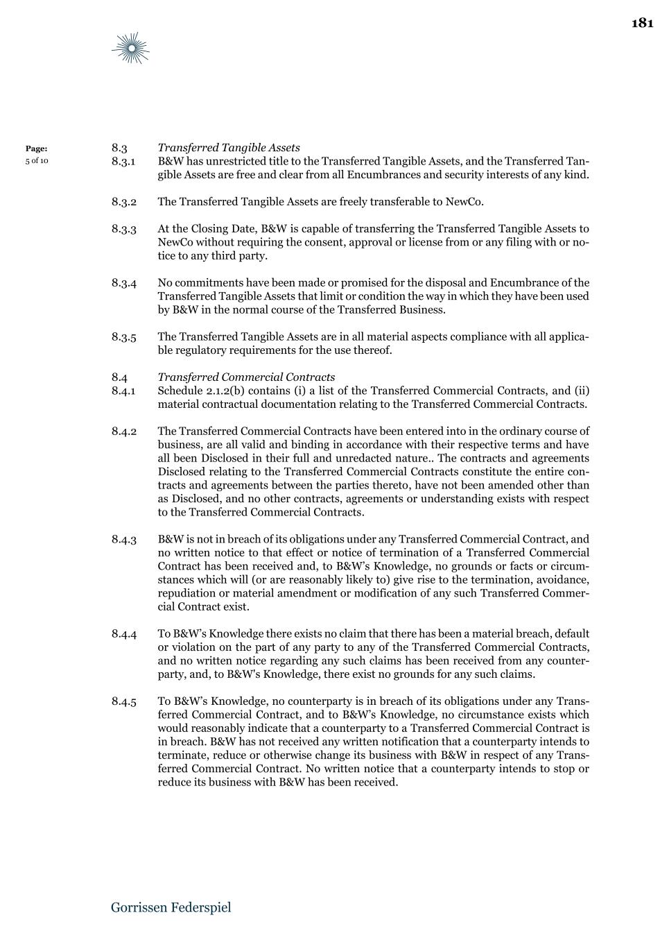 Page: 10 of 23 (jointly referred to as the “Sale Assets”). 2.1.3 For the avoidance of doubt, the Sale Assets shall not comprise the assets set out in Schedule 2.1.3 nor the Accounts Receivables (the “Excluded Assets”), which shall remain the property of B&W after the Closing Date. 2.1.4 Save for the liabilities set out in Schedule 2.1.3 and the Accounts Payables (the “Excluded Liabilities”) which shall remain the liabilities of B&W after the Closing Date, NewCo assumes and shall indemnify B&W in respect of the liabilities and obligations related to the Sale Assets to the extent that the source of such liability or obligation pertain to the period after the Closing Date and is accrued after the Closing Date, including, for the avoidance of doubt, any warranty claims under the Transferred Commercial Contracts (the “Assumed Liabilities”). B&W shall indemnify and hold NewCo harmless for any and all Loss regarding any Excluded Liabilities, and NewCo shall indemnify and hold B&W harmless for any and all Loss regarding any Assumed Liabilities. 2.1.5 Except as explicitly provided for in this Agreement, NewCo shall not acquire, assume or take over any asset not being a Sale Asset or any liability not being an Assumed Liability. 2.2 Legal transfer 2.2.1 Except as otherwise explicitly provided for in this Agreement, NewCo’s acquisition of the Sale Assets and the Assumed Liabilities from B&W shall have economic and, to the extent possible, legal effect from Closing. 2.2.2 The Parties shall, and shall use reasonable endeavours to procure that any relevant third party shall, do and execute and perform all such further deeds, bills of sale, documents, assurances, acts and things as may reasonably be required to give effect to this Agreement. 2.2.3 B&W shall ensure that NewCo on Closing receives all relevant information, correspondence, documents and all other business records that relates to the Transferred Business for the period prior to Closing and in particular all documents and records referenced in Schedule 2.1.2(a) (Transferred Tangible Assets). 3 Transferred Commercial Contracts 3.1 Assignment 3.1.1 Subject to the terms and conditions of this Agreement and effective as of Closing, B&W shall assign, and NewCo shall assume, all of B&W’s rights and future obligations under the Transferred Commercial Contracts. 3.1.2 The Parties and the parties to the Share Purchase Agreement have agreed, post-Closing on a best efforts basis, to seek to obtain executed acknowledgement letters (or otherwise in a form to be agreed between such parties) and otherwise transact in accordance with Clause 9.3. 4 Employees 4.1 TUPE transfer of Transferred Employees 14