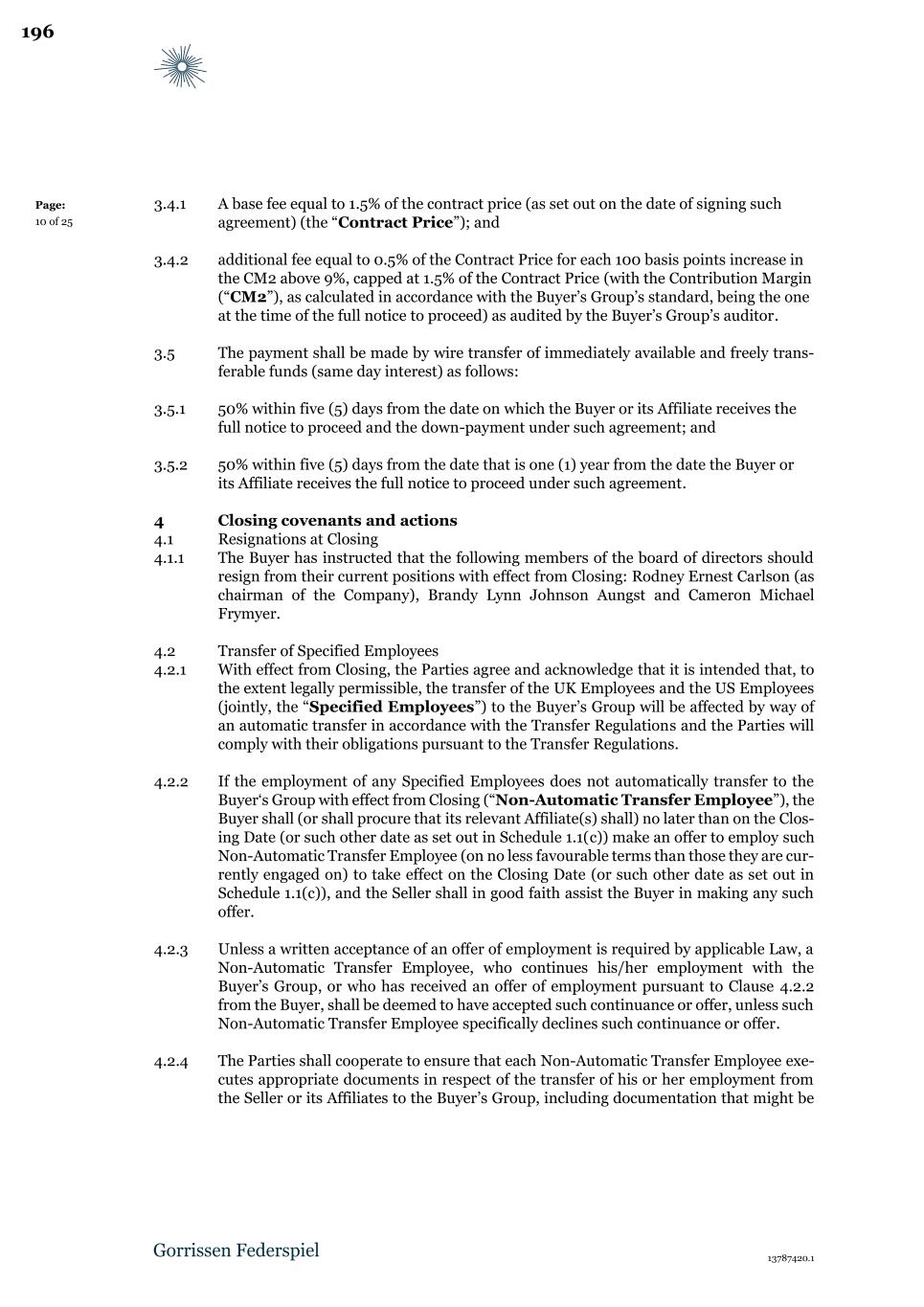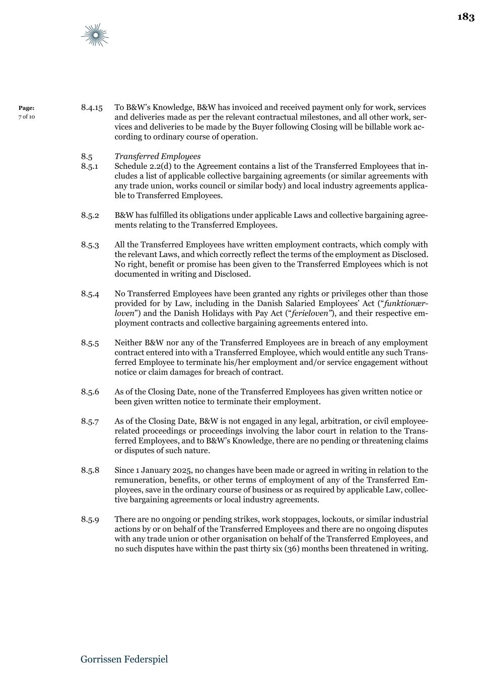 Page: 11 of 23 4.1.1 With effect from Closing, NewCo shall in accordance with the Danish Act on Transfer of Undertakings, take over the Transferred Employees on terms and conditions of employment as Disclosed. Accordingly, NewCo shall assume all rights and obligations of B&W towards the Transferred Employees. For the avoidance of doubt, the liabilities shall be taken over with effect from 23:59 on the Closing Date. 4.1.2 All liabilities and obligations related to the Transferred Employees which relate to the period prior to and including the Closing Date (including without limitation salary, pension, social security payments, bonus, holiday pay (in Danish: “feriepenge”), holiday supplements (in Danish: “ferietillæg”), special days of holiday (in Danish: “feriefridage”), withholding taxes and other similar financial obligations towards the Transferred Employees) shall be borne by B&W, and consequently B&W shall indemnify and hold NewCo harmless in respect of such liabilities and obligations. 4.1.3 B&W shall notify the Transferred Employees of the transfer of the Sale Assets from B&W to NewCo and of his/her respective status in connection therewith in accordance with applicable law. 4.1.4 B&W has in due time prior to the Closing Date informed and consulted trade unions, works councils, employee representatives and the Transferred Employees, to the extent required, in relation to the contemplated transfer, including any decision to complete the transfer, and the implications thereof, in accordance with applicable Law. 4.2 Personal data 4.2.1 Subject to applicable Law, NewCo shall as part of the transfer of the Transferred Employees take over B&W’s data related to the Transferred Employees and, in this respect, NewCo shall notify the Transferred Employees of the transfer of data and inform the Transferred Employees of the name of the new data controller, being NewCo, and provide further information required by applicable Law, including, but not limited to, the General Data Protection Regulation, to the Transferred Employees. 4.2.2 If, as part of the transfer of the Transferred Employees, B&W processes personal data that otherwise requires a data processing agreement to be put in place between NewCo and B&W, the Parties shall take any such reasonable action which may be necessary or appropriate in order for NewCo to legally process such data, including the signing of any required data processing agreement or other arrangements. 4.3 Credit cards 4.3.1 NewCo shall as soon as possible and in no event later than two (2) Business Days after Closing cause any Transferred Employee with access to corporate credit cards maintained under a B&W banking agreement to discontinue any usage thereof. NewCo shall reimburse B&W on a DKK for DKK basis from an against any and all expenses on such corporate credit cards that relate to the period following Closing. 5 Continuing services 5.1.1 For a transitional period following Closing, each Party has agreed to provide certain services to the other Party as further set out in the Transitional Services Agreement and the Legacy Contract Services Agreement. Further, NewCo agrees to perform and fulfil 15
