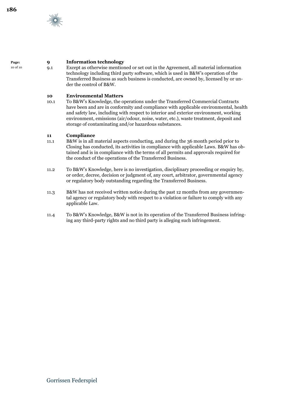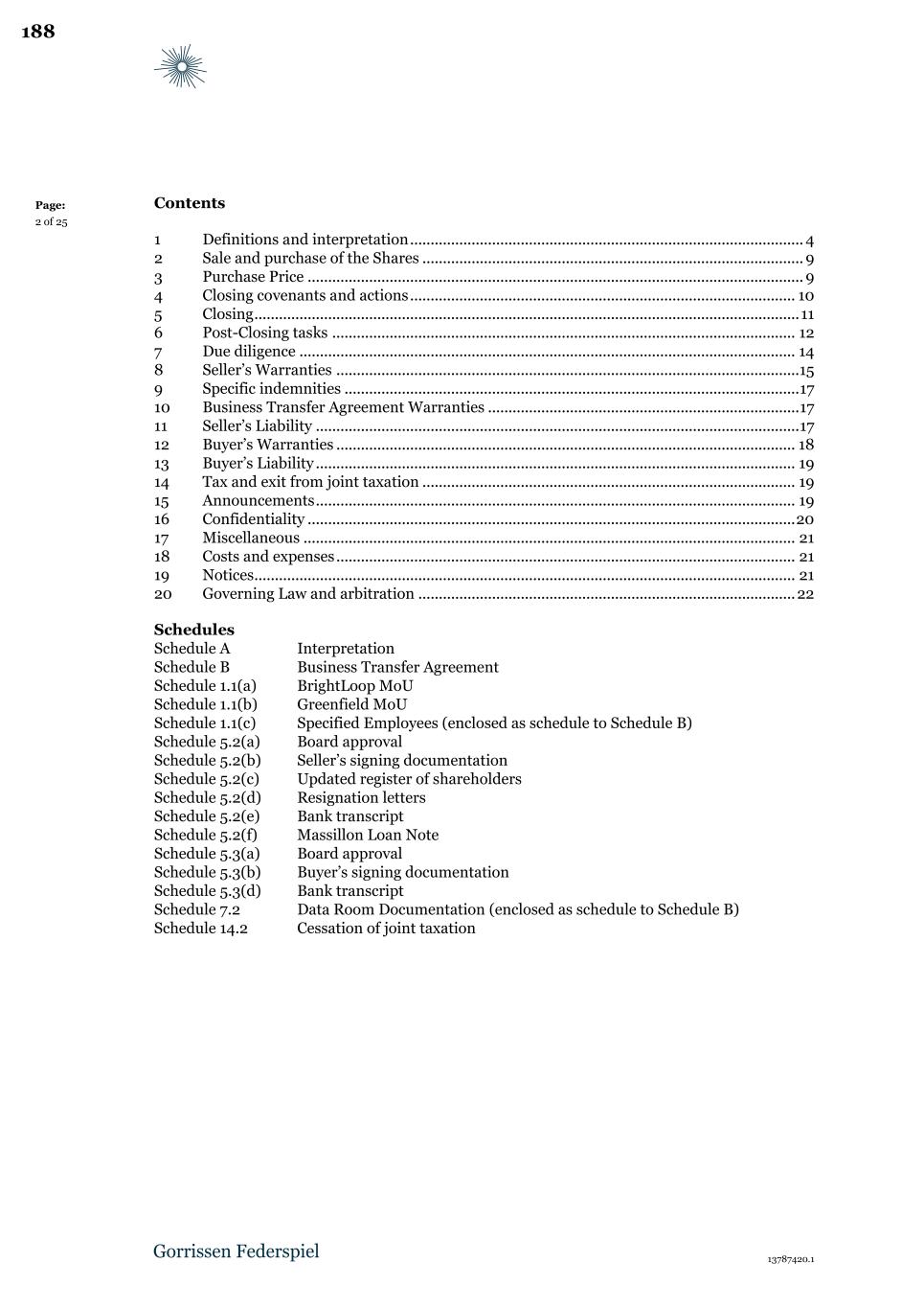 Page: 2 of 23 Table of Contents: 1 Definitions ............................................................................................................................... 3 2 Transfer of the Transferred Business ..................................................................................... 9 3 Transferred Commercial Contracts ...................................................................................... 10 4 Employees .............................................................................................................................. 10 5 Continuing services ................................................................................................................ 11 6 Purchase Price ....................................................................................................................... 12 7 VAT ......................................................................................................................................... 12 8 Closing .................................................................................................................................... 12 9 Post-Closing covenants and obligations............................................................................... 13 10 B&W Warranties .................................................................................................................... 16 11 B&W liability .......................................................................................................................... 16 12 NewCo Warranties ................................................................................................................ 20 13 Parent Guarantee ................................................................................................................... 21 14 NewCo liability ...................................................................................................................... 21 15 Governing Law and arbitration ............................................................................................ 21 Schedules Schedule 1.1(a) Legacy Contract Services Agreement Schedule 1.1(b) License Agreement Schedule 1.1(c) Subcontract Agreement Schedule 1.1(d) Transitional Services Agreement Schedule 2.1.2(a) Transferred Tangible Assets Schedule 2.1.2(b) Transferred Commercial Contracts Schedule 2.1.2(c) Transferred Employees Schedule 2.1.2(d) Transferred IP Schedule 2.1.3 Excluded Assets Schedule 2.1.4 Excluded Liabilities Schedule 6.3 Vendor Loan Note Schedule 8.1(a) Board approval Schedule 8.1(b) B&W’s signing documentation Schedule 8.2(a) Board approval Schedule 8.2(b) NewCo’s signing documentation Schedule 8.2(g) NewCo’s registration as employer and for VAT Schedule 9.2.1 Guarantees Schedule 10.1 B&W Warranties 6