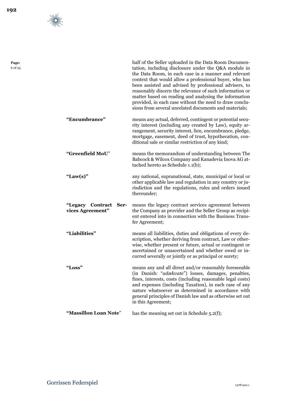 Page: 7 of 23 “Law(s)” any national, supranational, state, municipal or local or other applicable law and regulation in any country or jurisdiction and the regulations, rules and orders issued thereunder; “Legacy Contract Services Agreement” means the legacy contract services agreement between B&W Group and NewCo attached hereto as Schedule 1.1(a); “Liabilities” means all liabilities, duties and obligations of every description, whether deriving from contract, Law or otherwise, whether present or future, actual or contingent or ascertained or unascertained and whether owed or incurred severally or jointly or as principal or surety; “License Agreement” means the license agreement between B&W as licensee and NewCo as licensor attached hereto as Schedule 1.1(b); “Loss” means any and all direct and/or reasonably foreseeable (in Danish: “adækvate”) losses, damages, penalties, fines, interests, costs (including reasonable legal costs) and expenses (including Taxation), in each case of any nature whatsoever as determined in accordance with general principles of Danish law and as otherwise set out in this Agreement; “Lower Threshold” has the meaning set out in Clause 11.5.3; “Massillon Loan Note” means the loan note entered into between B&W and Kanadevia Inova DK on or around the Closing Date evidencing the loan provided for the purpose of financing the Massillon project; “NewCo” has the meaning set out in the recitals above; “NewCo Group” means NewCo, Kanadevia Inova DK and any Affiliate of Kanadevia Inova DK; “Party”/“Parties” has the meaning set out in the recitals above; “Person” means any individual, firm, corporate body, unincorporated association, government, state or agency of state, association, joint venture or partnership, in each case whether or not having a separate legal personality as well as any company, corporation or other corporate body wherever and 11