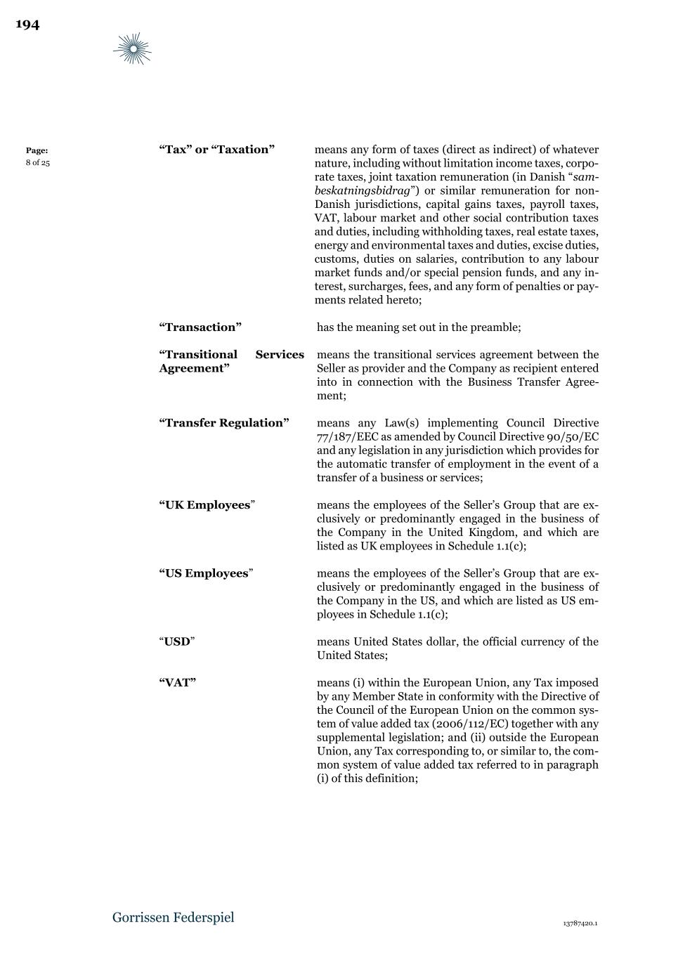 Page: 8 of 23 however incorporated or established, and shall include any successor (by merger or otherwise) of such entity; “Purchase Price” has the meaning set out in Clause 6.1; “Sale Assets” has the meaning set out in Clause 2.1.2; “Share Purchase Agreement” has the meaning set out in the recitals above; “Subcontract Agreement” means the subcontract agreement between B&W and NewCo attached hereto as Schedule 1.1(c); “Tax” or “Taxation” means any form of taxes (direct as indirect) of whatever nature, including without limitation income taxes, corporate taxes, joint taxation remuneration (in Danish “sambeskatningsbidrag”) or similar remuneration for non-Danish jurisdictions, capital gains taxes, payroll taxes, VAT, labour market and other social contribution taxes and duties, including withholding taxes, real estate taxes, energy and environmental taxes and duties, excise duties, customs, duties on salaries, contribution to any labour market funds and/or special pension funds, and any interest, surcharges, fees, and any form of penalties or payments related hereto; “Transaction” has the meaning set out in the recitals above; “Transferred Business” means the Sale Assets and the Assumed Liabilities; “Transferred Commercial Contracts” has the meaning set out in Clause 2.1.2(b); “Transferred Employees” has the meaning set out in Clause 2.1.2(c); “Transferred IP” has the meaning set out in Clause 2.1.2(d); “Transferred Tangible Assets” has the meaning set out in Clause 2.1.2(a); 12