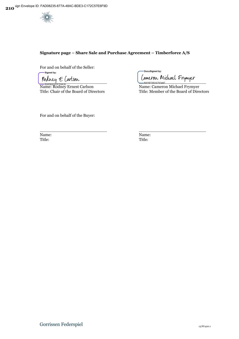 _____________________ _____________________ Docusign Envelope ID: FAD08235-877A-48AC-BDE3-C172C57E6F9D Signature page – Share Sale and Purchase Agreement – Timberforce A/S For and on behalf of the Seller: Title: Chair of the Board of Directors Name: Rodney Ernest Carlson __________________________ Title: Member of the Board of Directors Name: Cameron Michael Frymyer __________________________ For and on behalf of the Buyer: Title: Name: _____ Title: Name: _____ 13787420.1 210