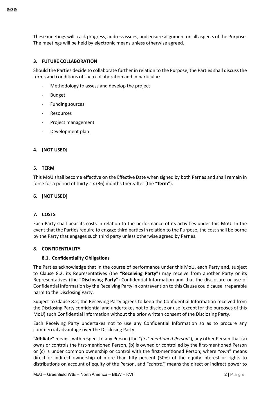 MoU – Greenfield WtE – North America – B&W – KVI 2 | P a g e These meetings will track progress, address issues, and ensure alignment on all aspects of the Purpose. The meetings will be held by electronic means unless otherwise agreed. 3. FUTURE COLLABORATION Should the Parties decide to collaborate further in relation to the Purpose, the Parties shall discuss the terms and conditions of such collaboration and in particular: - Methodology to assess and develop the project - Budget - Funding sources - Resources - Project management - Development plan 4. [NOT USED] 5. TERM This MoU shall become effec ve on the Effec ve Date when signed by both Par es and shall remain in force for a period of thirty-six (36) months therea er (the “Term”). 6. [NOT USED] 7. COSTS Each Party shall bear its costs in rela on to the performance of its ac vi es under this MoU. In the event that the Par es require to engage third par es in rela on to the Purpose, the cost shall be borne by the Party that engages such third party unless otherwise agreed by Par es. 8. CONFIDENTIALITY 8.1. Confidentiality Obligations The Parties acknowledge that in the course of performance under this MoU, each Party and, subject to Clause 8.2, its Representatives (the “Receiving Party”) may receive from another Party or its Representatives (the “Disclosing Party”) Confidential Information and that the disclosure or use of Confidential Information by the Receiving Party in contravention to this Clause could cause irreparable harm to the Disclosing Party. Subject to Clause 8.2, the Receiving Party agrees to keep the Confidential Information received from the Disclosing Party confidential and undertakes not to disclose or use (except for the purposes of this MoU) such Confidential Information without the prior written consent of the Disclosing Party. Each Receiving Party undertakes not to use any Confidential Information so as to procure any commercial advantage over the Disclosing Party. “Affiliate” means, with respect to any Person (the “first-men oned Person”), any other Person that (a) owns or controls the first-men oned Person, (b) is owned or controlled by the first-men oned Person or (c) is under common ownership or control with the first-men oned Person; where “own” means direct or indirect ownership of more than fi y percent (50%) of the equity interest or rights to distribu ons on account of equity of the Person, and “control” means the direct or indirect power to 222