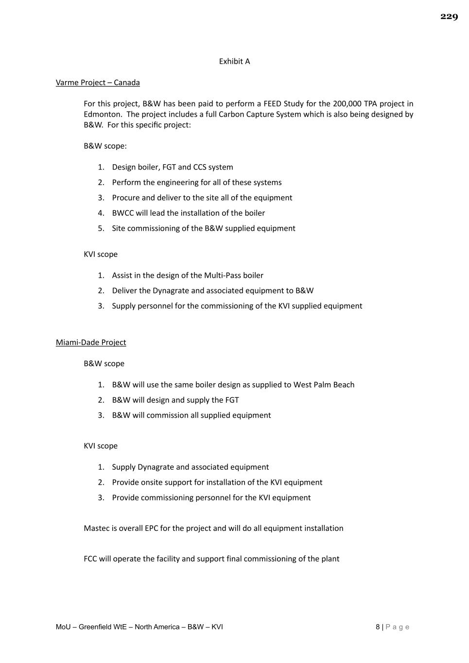 MoU – Greenfield WtE – North America – B&W – KVI 8 | P a g e Exhibit A Varme Project – Canada For this project, B&W has been paid to perform a FEED Study for the 200,000 TPA project in Edmonton. The project includes a full Carbon Capture System which is also being designed by B&W. For this specific project: B&W scope: 1. Design boiler, FGT and CCS system 2. Perform the engineering for all of these systems 3. Procure and deliver to the site all of the equipment 4. BWCC will lead the installation of the boiler 5. Site commissioning of the B&W supplied equipment KVI scope 1. Assist in the design of the Multi-Pass boiler 2. Deliver the Dynagrate and associated equipment to B&W 3. Supply personnel for the commissioning of the KVI supplied equipment Miami-Dade Project B&W scope 1. B&W will use the same boiler design as supplied to West Palm Beach 2. B&W will design and supply the FGT 3. B&W will commission all supplied equipment KVI scope 1. Supply Dynagrate and associated equipment 2. Provide onsite support for installation of the KVI equipment 3. Provide commissioning personnel for the KVI equipment Mastec is overall EPC for the project and will do all equipment installation FCC will operate the facility and support final commissioning of the plant 229