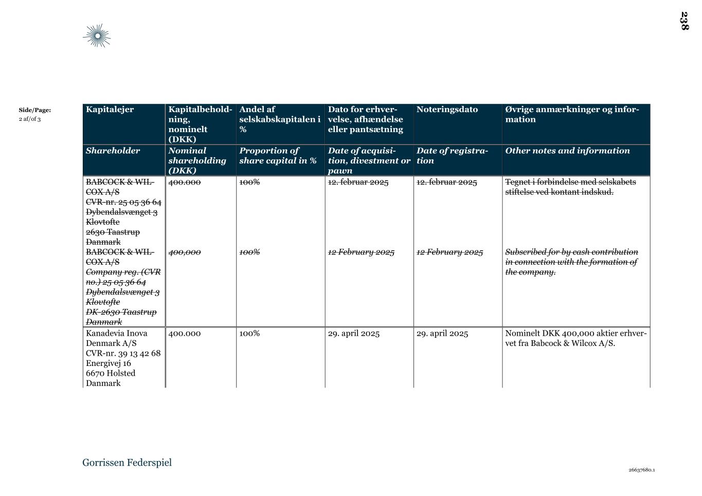 26637680.1 Side/Page: 2 af/of 3 Kapitalejer Kapitalbehold- ning, nominelt (DKK) Andel af selskabskapitalen i % Dato for erhver- velse, afhændelse eller pantsætning Noteringsdato Øvrige anmærkninger og infor- mation Shareholder Nominal shareholding (DKK) Proportion of share capital in % Date of acquisi- tion, divestment or pawn Date of registra- tion Other notes and information BABCOCK & WIL- COX A/S CVR-nr. 25 05 36 64 Dybendalsvænget 3 Klovtofte 2630 Taastrup Danmark 400.000 100% 12. februar 2025 12. februar 2025 Tegnet i forbindelse med selskabets stiftelse ved kontant indskud. BABCOCK & WIL- COX A/S Company reg. (CVR no.) 25 05 36 64 Dybendalsvænget 3 Klovtofte DK-2630 Taastrup Danmark 400,000 100% 12 February 2025 12 February 2025 Subscribed for by cash contribution in connection with the formation of the company. Kanadevia Inova Denmark A/S CVR-nr. 39 13 42 68 Energivej 16 6670 Holsted Danmark 400.000 100% 29. april 2025 29. april 2025 Nominelt DKK 400,000 aktier erhver- vet fra Babcock & Wilcox A/S. 2 3 8