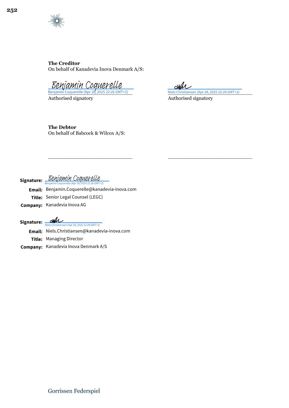 The Creditor On behalf of Kanadevia Inova Denmark A/S: ___________________________ ___________________________ Authorised signatory Authorised signatory The Debtor On behalf of Babcock & Wilcox A/S: ___________________________ ___________________________ 252