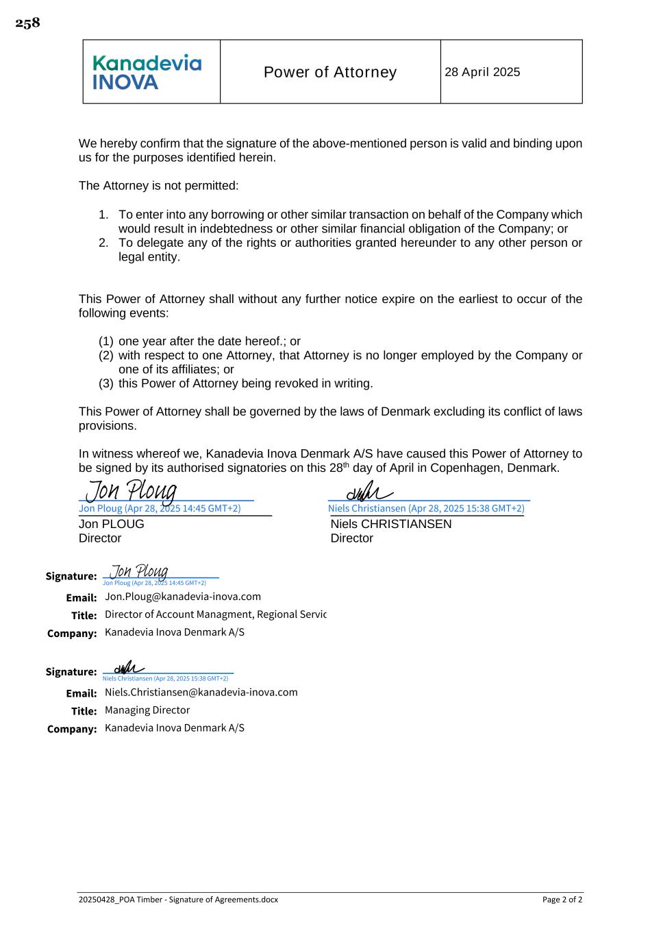 Power of Attorney 28 April 2025 20250428_POA Timber - Signature of Agreements.docx Page 2 of 2 We hereby confirm that the signature of the above-mentioned person is valid and binding upon us for the purposes identified herein. The Attorney is not permitted: 1. To enter into any borrowing or other similar transaction on behalf of the Company which would result in indebtedness or other similar financial obligation of the Company; or 2. To delegate any of the rights or authorities granted hereunder to any other person or legal entity. This Power of Attorney shall without any further notice expire on the earliest to occur of the following events: (1) one year after the date hereof.; or (2) with respect to one Attorney, that Attorney is no longer employed by the Company or one of its affiliates; or (3) this Power of Attorney being revoked in writing. This Power of Attorney shall be governed by the laws of Denmark excluding its conflict of laws provisions. In witness whereof we, Kanadevia Inova Denmark A/S have caused this Power of Attorney to be signed by its authorised signatories on this 28th day of April in Copenhagen, Denmark. Jon PLOUG Niels CHRISTIANSEN Director Director Signature: Email: Title: Company: Signature: Email: Title: Company: Jon Ploug (Apr 28, 2025 14:45 GMT+2) Jon Ploug Jon Ploug (Apr 28, 2025 14:45 GMT+2) Jon Ploug Jon.Ploug@kanadevia-inova.com Director of Account Managment, Regional Service Center (DRSC) Kanadevia Inova Denmark A/S Niels Christiansen (Apr 28, 2025 15:38 GMT+2) Niels Christiansen (Apr 28, 2025 15:38 GMT+2) Niels.Christiansen@kanadevia-inova.com Managing Director Kanadevia Inova Denmark A/S 258