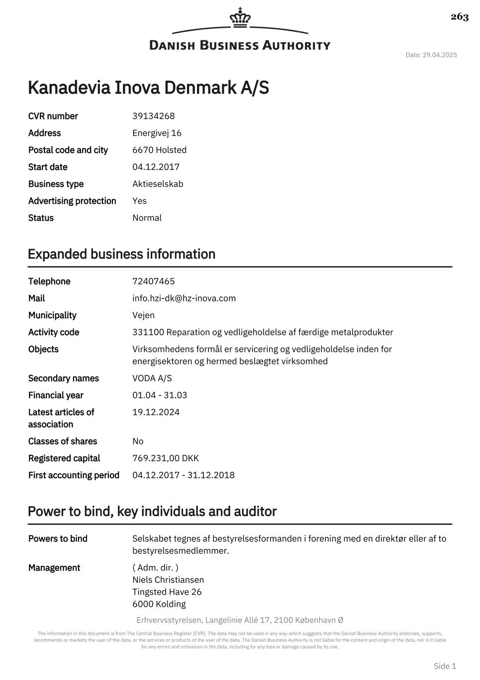 Dato: 29.04.2025 Erhvervsstyrelsen, Langelinie Allé 17, 2100 København Ø The information in this document is from The Central Business Register (CVR). The data may not be used in any way which suggests that the Danish Business Authority endorses, supports, recommends or markets the user of the data, or the services or products of the user of the data. The Danish Business Authority is not liable for the content and origin of the data, nor is it liable for any errors and omissions in the data, including for any loss or damage caused by its use. Side 1 Kanadevia Inova Denmark A/S CVR number 39134268 Address Energivej 16 Postal code and city 6670 Holsted Start date 04.12.2017 Business type Aktieselskab Advertising protection Yes Status Normal Expanded business information Telephone 72407465 Mail info.hzi-dk@hz-inova.com Municipality Vejen Activity code 331100 Reparation og vedligeholdelse af færdige metalprodukter Objects Virksomhedens formål er servicering og vedligeholdelse inden for energisektoren og hermed beslægtet virksomhed Secondary names VODA A/S Financial year 01.04 - 31.03 Latest articles of association 19.12.2024 Classes of shares No Registered capital 769.231,00 DKK First accounting period 04.12.2017 - 31.12.2018 Power to bind, key individuals and auditor Powers to bind Selskabet tegnes af bestyrelsesformanden i forening med en direktør eller af to bestyrelsesmedlemmer. Management ( Adm. dir. ) Niels Christiansen Tingsted Have 26 6000 Kolding 263
