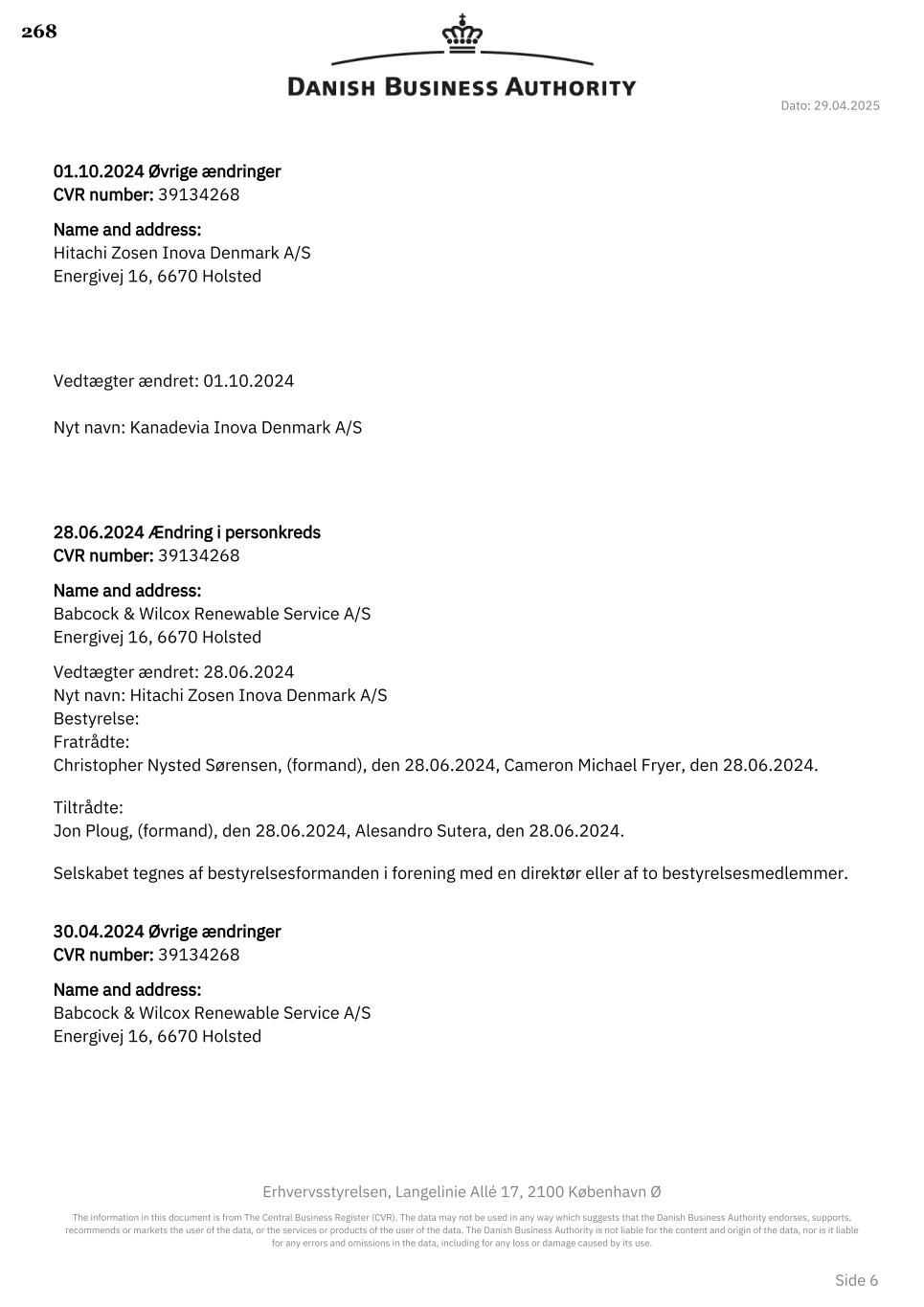 Dato: 29.04.2025 Erhvervsstyrelsen, Langelinie Allé 17, 2100 København Ø The information in this document is from The Central Business Register (CVR). The data may not be used in any way which suggests that the Danish Business Authority endorses, supports, recommends or markets the user of the data, or the services or products of the user of the data. The Danish Business Authority is not liable for the content and origin of the data, nor is it liable for any errors and omissions in the data, including for any loss or damage caused by its use. Side 6 01.10.2024 Øvrige ændringer 39134268CVR number: Name and address: Hitachi Zosen Inova Denmark A/S Energivej 16, 6670 Holsted Vedtægter ændret: 01.10.2024 Nyt navn: Kanadevia Inova Denmark A/S 28.06.2024 Ændring i personkreds 39134268CVR number: Name and address: Babcock & Wilcox Renewable Service A/S Energivej 16, 6670 Holsted Vedtægter ændret: 28.06.2024 Nyt navn: Hitachi Zosen Inova Denmark A/S Bestyrelse: Fratrådte: Christopher Nysted Sørensen, (formand), den 28.06.2024, Cameron Michael Fryer, den 28.06.2024. Tiltrådte: Jon Ploug, (formand), den 28.06.2024, Alesandro Sutera, den 28.06.2024. Selskabet tegnes af bestyrelsesformanden i forening med en direktør eller af to bestyrelsesmedlemmer. 30.04.2024 Øvrige ændringer 39134268CVR number: Name and address: Babcock & Wilcox Renewable Service A/S Energivej 16, 6670 Holsted 268