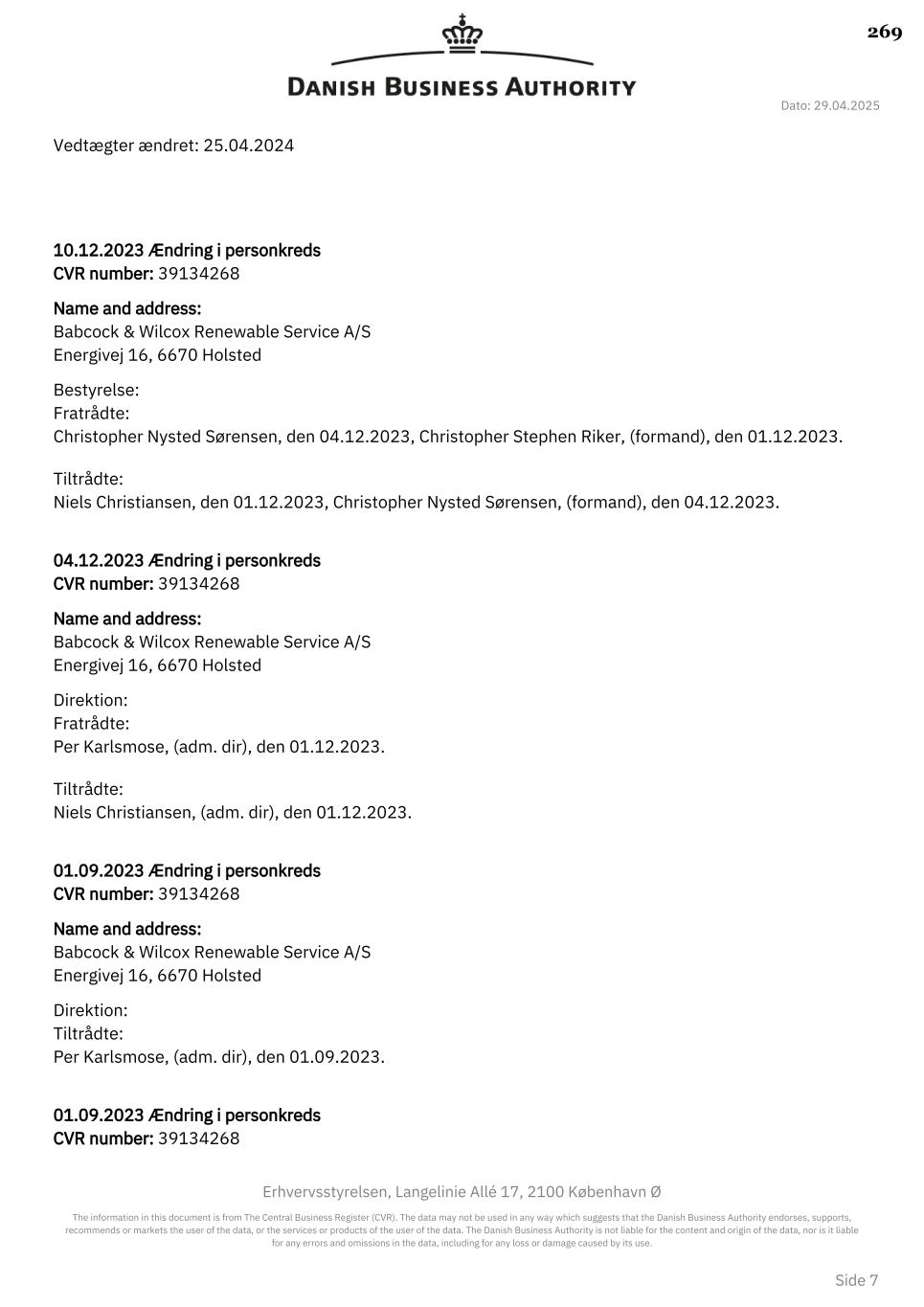 Dato: 29.04.2025 Erhvervsstyrelsen, Langelinie Allé 17, 2100 København Ø The information in this document is from The Central Business Register (CVR). The data may not be used in any way which suggests that the Danish Business Authority endorses, supports, recommends or markets the user of the data, or the services or products of the user of the data. The Danish Business Authority is not liable for the content and origin of the data, nor is it liable for any errors and omissions in the data, including for any loss or damage caused by its use. Side 7 Vedtægter ændret: 25.04.2024 10.12.2023 Ændring i personkreds 39134268CVR number: Name and address: Babcock & Wilcox Renewable Service A/S Energivej 16, 6670 Holsted Bestyrelse: Fratrådte: Christopher Nysted Sørensen, den 04.12.2023, Christopher Stephen Riker, (formand), den 01.12.2023. Tiltrådte: Niels Christiansen, den 01.12.2023, Christopher Nysted Sørensen, (formand), den 04.12.2023. 04.12.2023 Ændring i personkreds 39134268CVR number: Name and address: Babcock & Wilcox Renewable Service A/S Energivej 16, 6670 Holsted Direktion: Fratrådte: Per Karlsmose, (adm. dir), den 01.12.2023. Tiltrådte: Niels Christiansen, (adm. dir), den 01.12.2023. 01.09.2023 Ændring i personkreds 39134268CVR number: Name and address: Babcock & Wilcox Renewable Service A/S Energivej 16, 6670 Holsted Direktion: Tiltrådte: Per Karlsmose, (adm. dir), den 01.09.2023. 01.09.2023 Ændring i personkreds 39134268CVR number: 269
