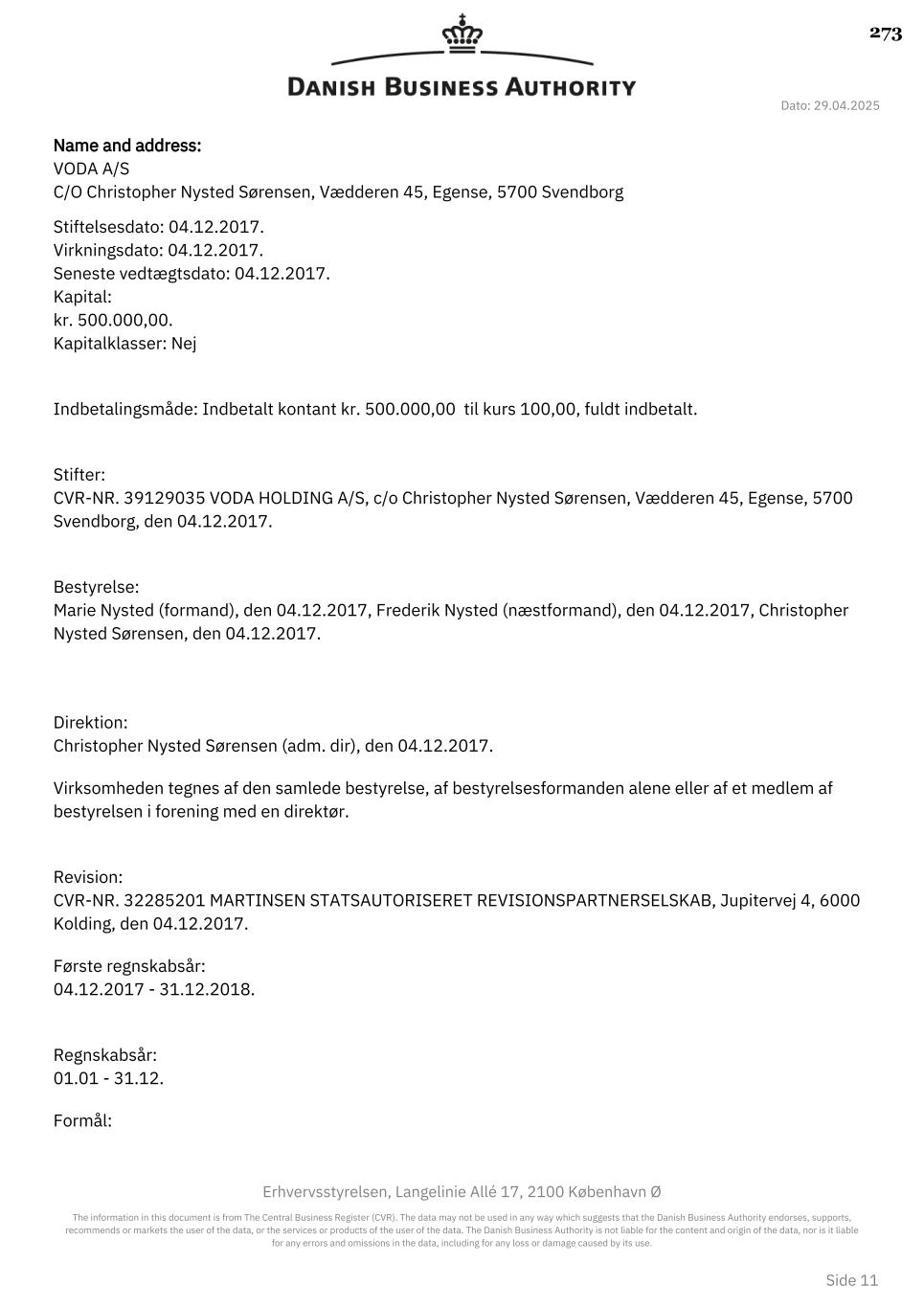 Dato: 29.04.2025 Erhvervsstyrelsen, Langelinie Allé 17, 2100 København Ø The information in this document is from The Central Business Register (CVR). The data may not be used in any way which suggests that the Danish Business Authority endorses, supports, recommends or markets the user of the data, or the services or products of the user of the data. The Danish Business Authority is not liable for the content and origin of the data, nor is it liable for any errors and omissions in the data, including for any loss or damage caused by its use. Side 11 Name and address: VODA A/S C/O Christopher Nysted Sørensen, Vædderen 45, Egense, 5700 Svendborg Stiftelsesdato: 04.12.2017. Virkningsdato: 04.12.2017. Seneste vedtægtsdato: 04.12.2017. Kapital: kr. 500.000,00. Kapitalklasser: Nej Indbetalingsmåde: Indbetalt kontant kr. 500.000,00 til kurs 100,00, fuldt indbetalt. Stifter: CVR-NR. 39129035 VODA HOLDING A/S, c/o Christopher Nysted Sørensen, Vædderen 45, Egense, 5700 Svendborg, den 04.12.2017. Bestyrelse: Marie Nysted (formand), den 04.12.2017, Frederik Nysted (næstformand), den 04.12.2017, Christopher Nysted Sørensen, den 04.12.2017. Direktion: Christopher Nysted Sørensen (adm. dir), den 04.12.2017. Virksomheden tegnes af den samlede bestyrelse, af bestyrelsesformanden alene eller af et medlem af bestyrelsen i forening med en direktør. Revision: CVR-NR. 32285201 MARTINSEN STATSAUTORISERET REVISIONSPARTNERSELSKAB, Jupitervej 4, 6000 Kolding, den 04.12.2017. Første regnskabsår: 04.12.2017 - 31.12.2018. Regnskabsår: 01.01 - 31.12. Formål: 273