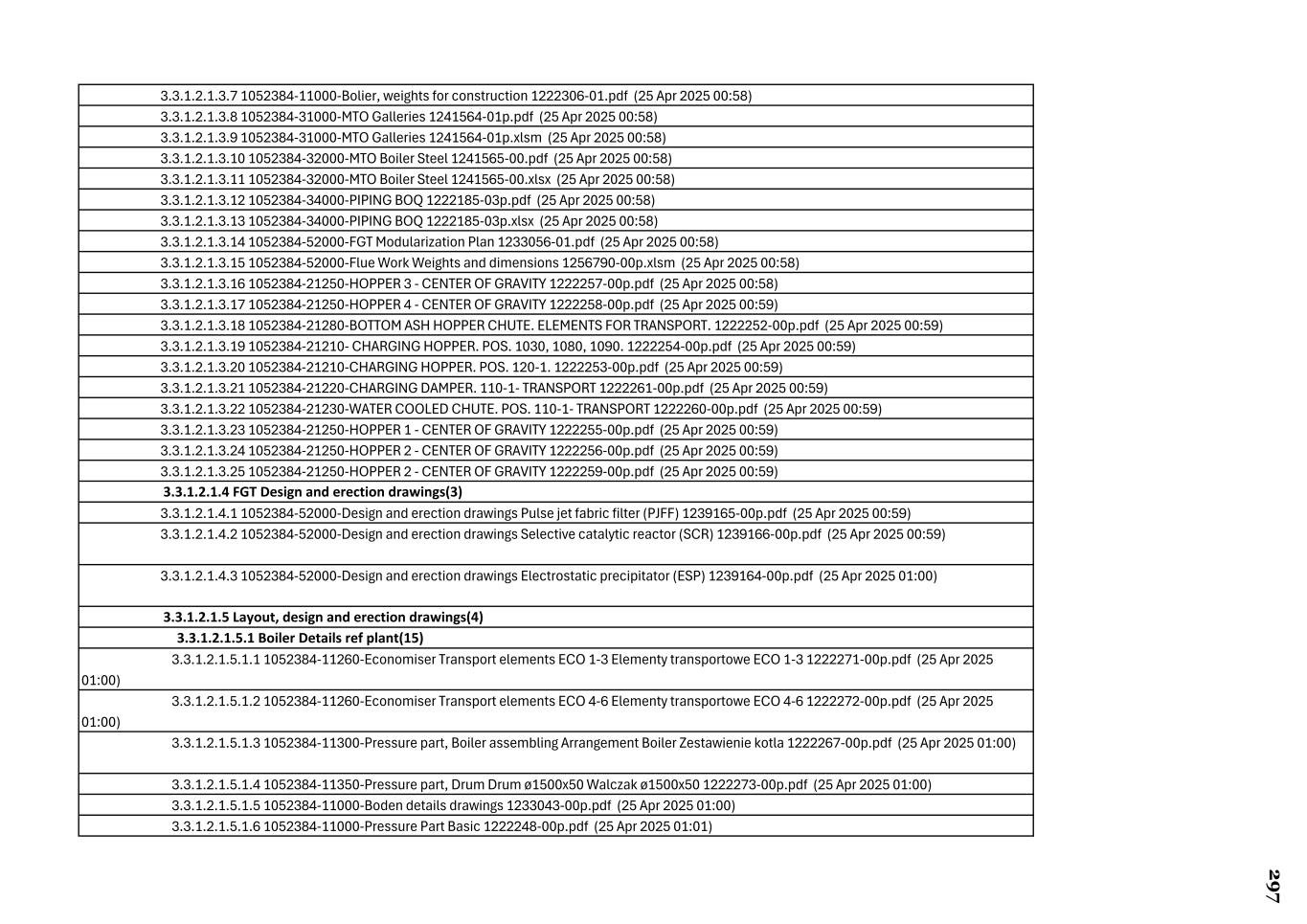 3.3.1.2.1.3.7 1052384-11000-Bolier, weights for construction 1222306-01.pdf (25 Apr 2025 00:58) 3.3.1.2.1.3.8 1052384-31000-MTO Galleries 1241564-01p.pdf (25 Apr 2025 00:58) 3.3.1.2.1.3.9 1052384-31000-MTO Galleries 1241564-01p.xlsm (25 Apr 2025 00:58) 3.3.1.2.1.3.10 1052384-32000-MTO Boiler Steel 1241565-00.pdf (25 Apr 2025 00:58) 3.3.1.2.1.3.11 1052384-32000-MTO Boiler Steel 1241565-00.xlsx (25 Apr 2025 00:58) 3.3.1.2.1.3.12 1052384-34000-PIPING BOQ 1222185-03p.pdf (25 Apr 2025 00:58) 3.3.1.2.1.3.13 1052384-34000-PIPING BOQ 1222185-03p.xlsx (25 Apr 2025 00:58) 3.3.1.2.1.3.14 1052384-52000-FGT Modularization Plan 1233056-01.pdf (25 Apr 2025 00:58) 3.3.1.2.1.3.15 1052384-52000-Flue Work Weights and dimensions 1256790-00p.xlsm (25 Apr 2025 00:58) 3.3.1.2.1.3.16 1052384-21250-HOPPER 3 - CENTER OF GRAVITY 1222257-00p.pdf (25 Apr 2025 00:58) 3.3.1.2.1.3.17 1052384-21250-HOPPER 4 - CENTER OF GRAVITY 1222258-00p.pdf (25 Apr 2025 00:59) 3.3.1.2.1.3.18 1052384-21280-BOTTOM ASH HOPPER CHUTE. ELEMENTS FOR TRANSPORT. 1222252-00p.pdf (25 Apr 2025 00:59) 3.3.1.2.1.3.19 1052384-21210- CHARGING HOPPER. POS. 1030, 1080, 1090. 1222254-00p.pdf (25 Apr 2025 00:59) 3.3.1.2.1.3.20 1052384-21210-CHARGING HOPPER. POS. 120-1. 1222253-00p.pdf (25 Apr 2025 00:59) 3.3.1.2.1.3.21 1052384-21220-CHARGING DAMPER. 110-1- TRANSPORT 1222261-00p.pdf (25 Apr 2025 00:59) 3.3.1.2.1.3.22 1052384-21230-WATER COOLED CHUTE. POS. 110-1- TRANSPORT 1222260-00p.pdf (25 Apr 2025 00:59) 3.3.1.2.1.3.23 1052384-21250-HOPPER 1 - CENTER OF GRAVITY 1222255-00p.pdf (25 Apr 2025 00:59) 3.3.1.2.1.3.24 1052384-21250-HOPPER 2 - CENTER OF GRAVITY 1222256-00p.pdf (25 Apr 2025 00:59) 3.3.1.2.1.3.25 1052384-21250-HOPPER 2 - CENTER OF GRAVITY 1222259-00p.pdf (25 Apr 2025 00:59) 3.3.1.2.1.4 FGT Design and erection drawings(3) 3.3.1.2.1.4.1 1052384-52000-Design and erection drawings Pulse jet fabric filter (PJFF) 1239165-00p.pdf (25 Apr 2025 00:59) 3.3.1.2.1.4.2 1052384-52000-Design and erection drawings Selective catalytic reactor (SCR) 1239166-00p.pdf (25 Apr 2025 00:59) 3.3.1.2.1.4.3 1052384-52000-Design and erection drawings Electrostatic precipitator (ESP) 1239164-00p.pdf (25 Apr 2025 01:00) 3.3.1.2.1.5 Layout, design and erection drawings(4) 3.3.1.2.1.5.1 Boiler Details ref plant(15) 3.3.1.2.1.5.1.1 1052384-11260-Economiser Transport elements ECO 1-3 Elementy transportowe ECO 1-3 1222271-00p.pdf (25 Apr 2025 01:00) 3.3.1.2.1.5.1.2 1052384-11260-Economiser Transport elements ECO 4-6 Elementy transportowe ECO 4-6 1222272-00p.pdf (25 Apr 2025 01:00) 3.3.1.2.1.5.1.3 1052384-11300-Pressure part, Boiler assembling Arrangement Boiler Zestawienie kotla 1222267-00p.pdf (25 Apr 2025 01:00) 3.3.1.2.1.5.1.4 1052384-11350-Pressure part, Drum Drum ø1500x50 Walczak ø1500x50 1222273-00p.pdf (25 Apr 2025 01:00) 3.3.1.2.1.5.1.5 1052384-11000-Boden details drawings 1233043-00p.pdf (25 Apr 2025 01:00) 3.3.1.2.1.5.1.6 1052384-11000-Pressure Part Basic 1222248-00p.pdf (25 Apr 2025 01:01) 2 9 7