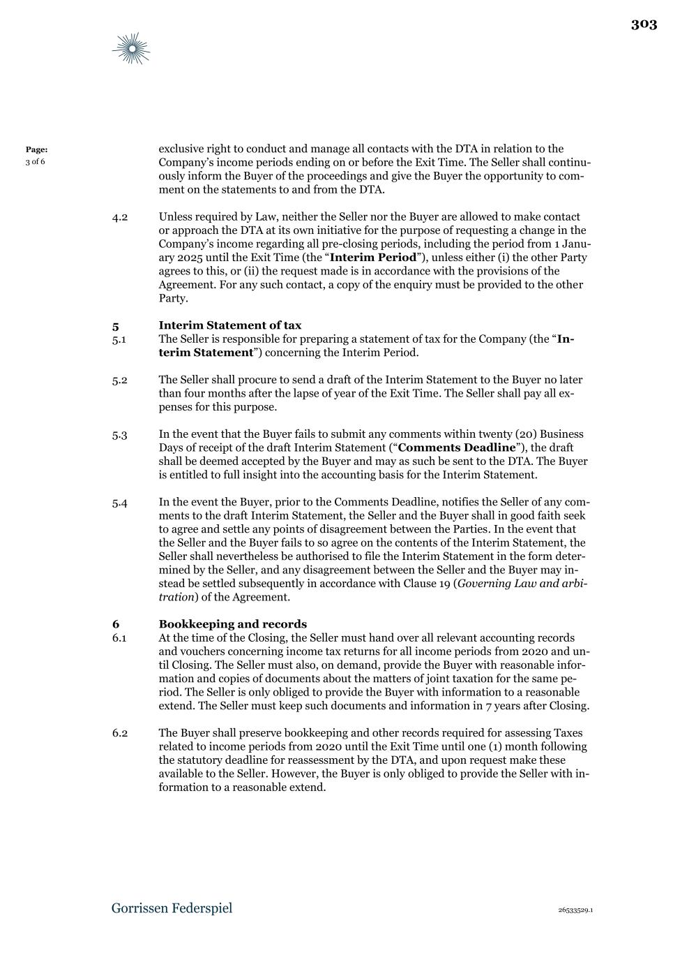 26533529.1 Page: 3 of 6 exclusive right to conduct and manage all contacts with the DTA in relation to the Company’s income periods ending on or before the Exit Time. The Seller shall continu- ously inform the Buyer of the proceedings and give the Buyer the opportunity to com- ment on the statements to and from the DTA. 4.2 Unless required by Law, neither the Seller nor the Buyer are allowed to make contact or approach the DTA at its own initiative for the purpose of requesting a change in the Company’s income regarding all pre-closing periods, including the period from 1 Janu- ary 2025 until the Exit Time (the “Interim Period”), unless either (i) the other Party agrees to this, or (ii) the request made is in accordance with the provisions of the Agreement. For any such contact, a copy of the enquiry must be provided to the other Party. 5 Interim Statement of tax 5.1 The Seller is responsible for preparing a statement of tax for the Company (the “In- terim Statement”) concerning the Interim Period. 5.2 The Seller shall procure to send a draft of the Interim Statement to the Buyer no later than four months after the lapse of year of the Exit Time. The Seller shall pay all ex- penses for this purpose. 5.3 In the event that the Buyer fails to submit any comments within twenty (20) Business Days of receipt of the draft Interim Statement (“Comments Deadline”), the draft shall be deemed accepted by the Buyer and may as such be sent to the DTA. The Buyer is entitled to full insight into the accounting basis for the Interim Statement. 5.4 In the event the Buyer, prior to the Comments Deadline, notifies the Seller of any com- ments to the draft Interim Statement, the Seller and the Buyer shall in good faith seek to agree and settle any points of disagreement between the Parties. In the event that the Seller and the Buyer fails to so agree on the contents of the Interim Statement, the Seller shall nevertheless be authorised to file the Interim Statement in the form deter- mined by the Seller, and any disagreement between the Seller and the Buyer may in- stead be settled subsequently in accordance with Clause 19 (Governing Law and arbi- tration) of the Agreement. 6 Bookkeeping and records 6.1 At the time of the Closing, the Seller must hand over all relevant accounting records and vouchers concerning income tax returns for all income periods from 2020 and un- til Closing. The Seller must also, on demand, provide the Buyer with reasonable infor- mation and copies of documents about the matters of joint taxation for the same pe- riod. The Seller is only obliged to provide the Buyer with information to a reasonable extend. The Seller must keep such documents and information in 7 years after Closing. 6.2 The Buyer shall preserve bookkeeping and other records required for assessing Taxes related to income periods from 2020 until the Exit Time until one (1) month following the statutory deadline for reassessment by the DTA, and upon request make these available to the Seller. However, the Buyer is only obliged to provide the Seller with in- formation to a reasonable extend. 303