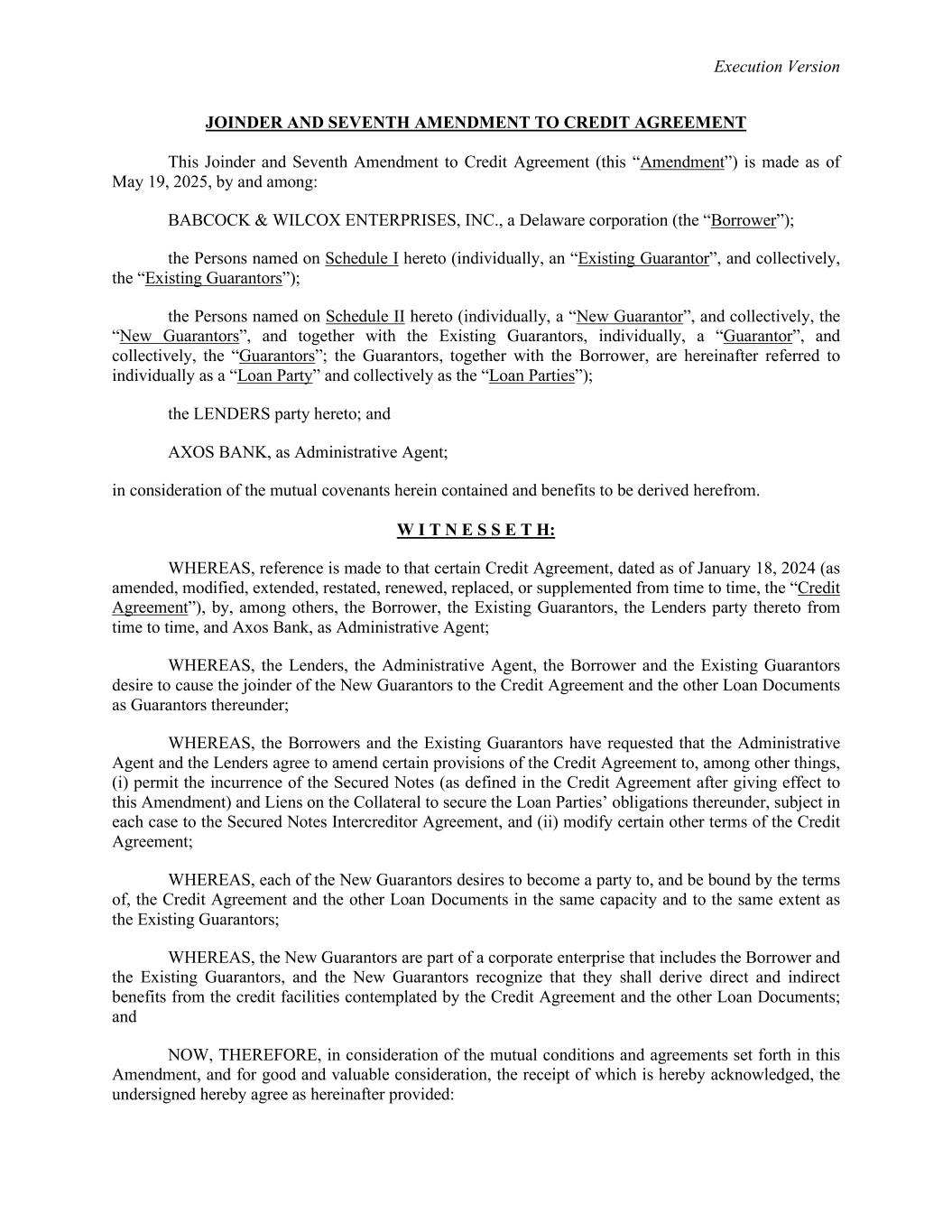 Execution Version JOINDER AND SEVENTH AMENDMENT TO CREDIT AGREEMENT This Joinder and Seventh Amendment to Credit Agreement (this “Amendment”) is made as of May 19, 2025, by and among: BABCOCK & WILCOX ENTERPRISES, INC., a Delaware corporation (the “Borrower”); the Persons named on Schedule I hereto (individually, an “Existing Guarantor”, and collectively, the “Existing Guarantors”); the Persons named on Schedule II hereto (individually, a “New Guarantor”, and collectively, the “New Guarantors”, and together with the Existing Guarantors, individually, a “Guarantor”, and collectively, the “Guarantors”; the Guarantors, together with the Borrower, are hereinafter referred to individually as a “Loan Party” and collectively as the “Loan Parties”); the LENDERS party hereto; and AXOS BANK, as Administrative Agent; in consideration of the mutual covenants herein contained and benefits to be derived herefrom. W I T N E S S E T H: WHEREAS, reference is made to that certain Credit Agreement, dated as of January 18, 2024 (as amended, modified, extended, restated, renewed, replaced, or supplemented from time to time, the “Credit Agreement”), by, among others, the Borrower, the Existing Guarantors, the Lenders party thereto from time to time, and Axos Bank, as Administrative Agent; WHEREAS, the Lenders, the Administrative Agent, the Borrower and the Existing Guarantors desire to cause the joinder of the New Guarantors to the Credit Agreement and the other Loan Documents as Guarantors thereunder; WHEREAS, the Borrowers and the Existing Guarantors have requested that the Administrative Agent and the Lenders agree to amend certain provisions of the Credit Agreement to, among other things, (i) permit the incurrence of the Secured Notes (as defined in the Credit Agreement after giving effect to this Amendment) and Liens on the Collateral to secure the Loan Parties’ obligations thereunder, subject in each case to the Secured Notes Intercreditor Agreement, and (ii) modify certain other terms of the Credit Agreement; WHEREAS, each of the New Guarantors desires to become a party to, and be bound by the terms of, the Credit Agreement and the other Loan Documents in the same capacity and to the same extent as the Existing Guarantors; WHEREAS, the New Guarantors are part of a corporate enterprise that includes the Borrower and the Existing Guarantors, and the New Guarantors recognize that they shall derive direct and indirect benefits from the credit facilities contemplated by the Credit Agreement and the other Loan Documents; and NOW, THEREFORE, in consideration of the mutual conditions and agreements set forth in this Amendment, and for good and valuable consideration, the receipt of which is hereby acknowledged, the undersigned hereby agree as hereinafter provided: