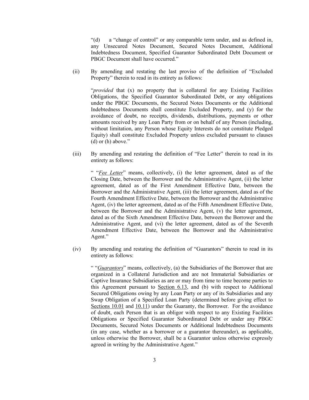 3 “(d) a “change of control” or any comparable term under, and as defined in, any Unsecured Notes Document, Secured Notes Document, Additional Indebtedness Document, Specified Guarantor Subordinated Debt Document or PBGC Document shall have occurred.” (ii) By amending and restating the last proviso of the definition of “Excluded Property” therein to read in its entirety as follows: “provided that (x) no property that is collateral for any Existing Facilities Obligations, the Specified Guarantor Subordinated Debt, or any obligations under the PBGC Documents, the Secured Notes Documents or the Additional Indebtedness Documents shall constitute Excluded Property, and (y) for the avoidance of doubt, no receipts, dividends, distributions, payments or other amounts received by any Loan Party from or on behalf of any Person (including, without limitation, any Person whose Equity Interests do not constitute Pledged Equity) shall constitute Excluded Property unless excluded pursuant to clauses (d) or (h) above.” (iii) By amending and restating the definition of “Fee Letter” therein to read in its entirety as follows: “ “Fee Letter” means, collectively, (i) the letter agreement, dated as of the Closing Date, between the Borrower and the Administrative Agent, (ii) the letter agreement, dated as of the First Amendment Effective Date, between the Borrower and the Administrative Agent, (iii) the letter agreement, dated as of the Fourth Amendment Effective Date, between the Borrower and the Administrative Agent, (iv) the letter agreement, dated as of the Fifth Amendment Effective Date, between the Borrower and the Administrative Agent, (v) the letter agreement, dated as of the Sixth Amendment Effective Date, between the Borrower and the Administrative Agent, and (vi) the letter agreement, dated as of the Seventh Amendment Effective Date, between the Borrower and the Administrative Agent.” (iv) By amending and restating the definition of “Guarantors” therein to read in its entirety as follows: “ “Guarantors” means, collectively, (a) the Subsidiaries of the Borrower that are organized in a Collateral Jurisdiction and are not Immaterial Subsidiaries or Captive Insurance Subsidiaries as are or may from time to time become parties to this Agreement pursuant to Section 6.13, and (b) with respect to Additional Secured Obligations owing by any Loan Party or any of its Subsidiaries and any Swap Obligation of a Specified Loan Party (determined before giving effect to Sections 10.01 and 10.11) under the Guaranty, the Borrower. For the avoidance of doubt, each Person that is an obligor with respect to any Existing Facilities Obligations or Specified Guarantor Subordinated Debt or under any PBGC Documents, Secured Notes Documents or Additional Indebtedness Documents (in any case, whether as a borrower or a guarantor thereunder), as applicable, unless otherwise the Borrower, shall be a Guarantor unless otherwise expressly agreed in writing by the Administrative Agent.”