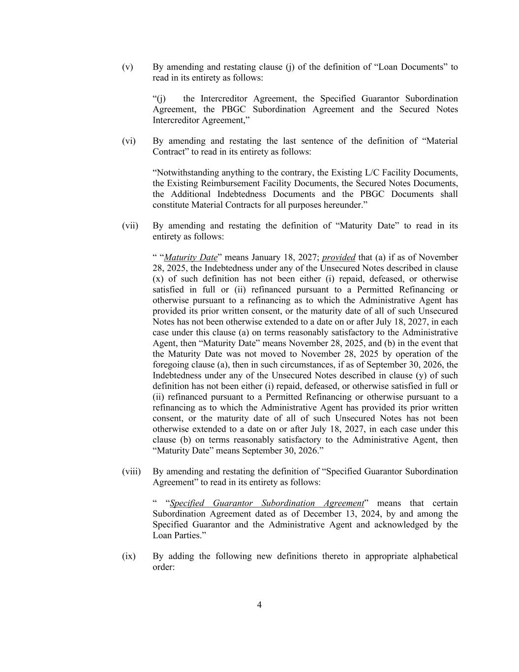 4 (v) By amending and restating clause (j) of the definition of “Loan Documents” to read in its entirety as follows: “(j) the Intercreditor Agreement, the Specified Guarantor Subordination Agreement, the PBGC Subordination Agreement and the Secured Notes Intercreditor Agreement,” (vi) By amending and restating the last sentence of the definition of “Material Contract” to read in its entirety as follows: “Notwithstanding anything to the contrary, the Existing L/C Facility Documents, the Existing Reimbursement Facility Documents, the Secured Notes Documents, the Additional Indebtedness Documents and the PBGC Documents shall constitute Material Contracts for all purposes hereunder.” (vii) By amending and restating the definition of “Maturity Date” to read in its entirety as follows: “ “Maturity Date” means January 18, 2027; provided that (a) if as of November 28, 2025, the Indebtedness under any of the Unsecured Notes described in clause (x) of such definition has not been either (i) repaid, defeased, or otherwise satisfied in full or (ii) refinanced pursuant to a Permitted Refinancing or otherwise pursuant to a refinancing as to which the Administrative Agent has provided its prior written consent, or the maturity date of all of such Unsecured Notes has not been otherwise extended to a date on or after July 18, 2027, in each case under this clause (a) on terms reasonably satisfactory to the Administrative Agent, then “Maturity Date” means November 28, 2025, and (b) in the event that the Maturity Date was not moved to November 28, 2025 by operation of the foregoing clause (a), then in such circumstances, if as of September 30, 2026, the Indebtedness under any of the Unsecured Notes described in clause (y) of such definition has not been either (i) repaid, defeased, or otherwise satisfied in full or (ii) refinanced pursuant to a Permitted Refinancing or otherwise pursuant to a refinancing as to which the Administrative Agent has provided its prior written consent, or the maturity date of all of such Unsecured Notes has not been otherwise extended to a date on or after July 18, 2027, in each case under this clause (b) on terms reasonably satisfactory to the Administrative Agent, then “Maturity Date” means September 30, 2026.” (viii) By amending and restating the definition of “Specified Guarantor Subordination Agreement” to read in its entirety as follows: “ “Specified Guarantor Subordination Agreement” means that certain Subordination Agreement dated as of December 13, 2024, by and among the Specified Guarantor and the Administrative Agent and acknowledged by the Loan Parties.” (ix) By adding the following new definitions thereto in appropriate alphabetical order: