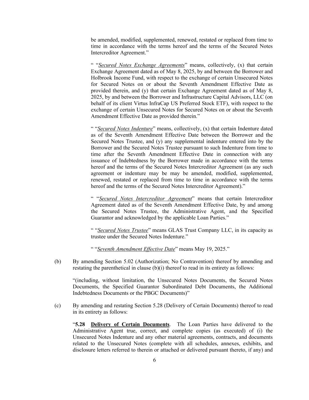 6 be amended, modified, supplemented, renewed, restated or replaced from time to time in accordance with the terms hereof and the terms of the Secured Notes Intercreditor Agreement.” “ “Secured Notes Exchange Agreements” means, collectively, (x) that certain Exchange Agreement dated as of May 8, 2025, by and between the Borrower and Holbrook Income Fund, with respect to the exchange of certain Unsecured Notes for Secured Notes on or about the Seventh Amendment Effective Date as provided therein, and (y) that certain Exchange Agreement dated as of May 8, 2025, by and between the Borrower and Infrastructure Capital Advisors, LLC (on behalf of its client Virtus InfraCap US Preferred Stock ETF), with respect to the exchange of certain Unsecured Notes for Secured Notes on or about the Seventh Amendment Effective Date as provided therein.” “ “Secured Notes Indenture” means, collectively, (x) that certain Indenture dated as of the Seventh Amendment Effective Date between the Borrower and the Secured Notes Trustee, and (y) any supplemental indenture entered into by the Borrower and the Secured Notes Trustee pursuant to such Indenture from time to time after the Seventh Amendment Effective Date in connection with any issuance of Indebtedness by the Borrower made in accordance with the terms hereof and the terms of the Secured Notes Intercreditor Agreement (as any such agreement or indenture may be may be amended, modified, supplemented, renewed, restated or replaced from time to time in accordance with the terms hereof and the terms of the Secured Notes Intercreditor Agreement).” “ “Secured Notes Intercreditor Agreement” means that certain Intercreditor Agreement dated as of the Seventh Amendment Effective Date, by and among the Secured Notes Trustee, the Administrative Agent, and the Specified Guarantor and acknowledged by the applicable Loan Parties.” “ “Secured Notes Trustee” means GLAS Trust Company LLC, in its capacity as trustee under the Secured Notes Indenture.” “ “Seventh Amendment Effective Date” means May 19, 2025.” (b) By amending Section 5.02 (Authorization; No Contravention) thereof by amending and restating the parenthetical in clause (b)(i) thereof to read in its entirety as follows: “(including, without limitation, the Unsecured Notes Documents, the Secured Notes Documents, the Specified Guarantor Subordinated Debt Documents, the Additional Indebtedness Documents or the PBGC Documents)” (c) By amending and restating Section 5.28 (Delivery of Certain Documents) thereof to read in its entirety as follows: “5.28 Delivery of Certain Documents. The Loan Parties have delivered to the Administrative Agent true, correct, and complete copies (as executed) of (i) the Unsecured Notes Indenture and any other material agreements, contracts, and documents related to the Unsecured Notes (complete with all schedules, annexes, exhibits, and disclosure letters referred to therein or attached or delivered pursuant thereto, if any) and
