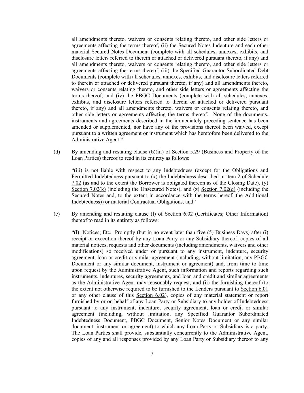 7 all amendments thereto, waivers or consents relating thereto, and other side letters or agreements affecting the terms thereof, (ii) the Secured Notes Indenture and each other material Secured Notes Document (complete with all schedules, annexes, exhibits, and disclosure letters referred to therein or attached or delivered pursuant thereto, if any) and all amendments thereto, waivers or consents relating thereto, and other side letters or agreements affecting the terms thereof, (iii) the Specified Guarantor Subordinated Debt Documents (complete with all schedules, annexes, exhibits, and disclosure letters referred to therein or attached or delivered pursuant thereto, if any) and all amendments thereto, waivers or consents relating thereto, and other side letters or agreements affecting the terms thereof, and (iv) the PBGC Documents (complete with all schedules, annexes, exhibits, and disclosure letters referred to therein or attached or delivered pursuant thereto, if any) and all amendments thereto, waivers or consents relating thereto, and other side letters or agreements affecting the terms thereof. None of the documents, instruments and agreements described in the immediately preceding sentence has been amended or supplemented, nor have any of the provisions thereof been waived, except pursuant to a written agreement or instrument which has heretofore been delivered to the Administrative Agent.” (d) By amending and restating clause (b)(iii) of Section 5.29 (Business and Property of the Loan Parties) thereof to read in its entirety as follows: “(iii) is not liable with respect to any Indebtedness (except for the Obligations and Permitted Indebtedness pursuant to (x) the Indebtedness described in item 2 of Schedule 7.02 (as and to the extent the Borrower is obligated thereon as of the Closing Date), (y) Section 7.02(k) (including the Unsecured Notes), and (z) Section 7.02(q) (including the Secured Notes and, to the extent in accordance with the terms hereof, the Additional Indebtedness)) or material Contractual Obligations, and” (e) By amending and restating clause (l) of Section 6.02 (Certificates; Other Information) thereof to read in its entirety as follows: “(l) Notices; Etc. Promptly (but in no event later than five (5) Business Days) after (i) receipt or execution thereof by any Loan Party or any Subsidiary thereof, copies of all material notices, requests and other documents (including amendments, waivers and other modifications) so received under or pursuant to any instrument, indenture, security agreement, loan or credit or similar agreement (including, without limitation, any PBGC Document or any similar document, instrument or agreement) and, from time to time upon request by the Administrative Agent, such information and reports regarding such instruments, indentures, security agreements, and loan and credit and similar agreements as the Administrative Agent may reasonably request, and (ii) the furnishing thereof (to the extent not otherwise required to be furnished to the Lenders pursuant to Section 6.01 or any other clause of this Section 6.02), copies of any material statement or report furnished by or on behalf of any Loan Party or Subsidiary to any holder of Indebtedness pursuant to any instrument, indenture, security agreement, loan or credit or similar agreement (including, without limitation, any Specified Guarantor Subordinated Indebtedness Document, PBGC Document, Senior Notes Document or any similar document, instrument or agreement) to which any Loan Party or Subsidiary is a party. The Loan Parties shall provide, substantially concurrently to the Administrative Agent, copies of any and all responses provided by any Loan Party or Subsidiary thereof to any
