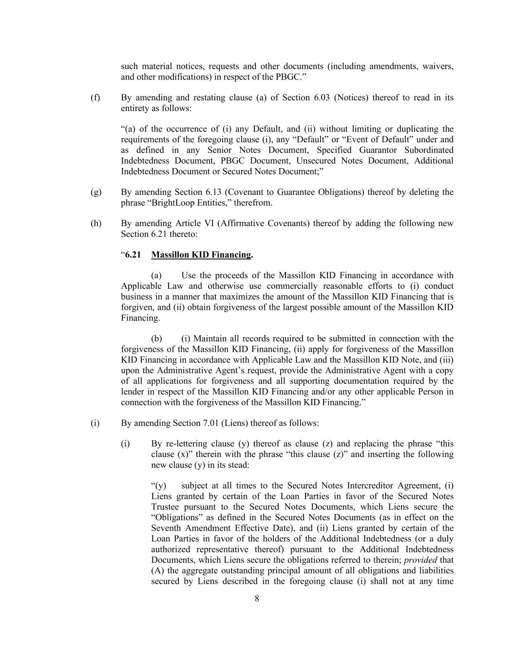 8 such material notices, requests and other documents (including amendments, waivers, and other modifications) in respect of the PBGC.” (f) By amending and restating clause (a) of Section 6.03 (Notices) thereof to read in its entirety as follows: “(a) of the occurrence of (i) any Default, and (ii) without limiting or duplicating the requirements of the foregoing clause (i), any “Default” or “Event of Default” under and as defined in any Senior Notes Document, Specified Guarantor Subordinated Indebtedness Document, PBGC Document, Unsecured Notes Document, Additional Indebtedness Document or Secured Notes Document;” (g) By amending Section 6.13 (Covenant to Guarantee Obligations) thereof by deleting the phrase “BrightLoop Entities,” therefrom. (h) By amending Article VI (Affirmative Covenants) thereof by adding the following new Section 6.21 thereto: “6.21 Massillon KID Financing. (a) Use the proceeds of the Massillon KID Financing in accordance with Applicable Law and otherwise use commercially reasonable efforts to (i) conduct business in a manner that maximizes the amount of the Massillon KID Financing that is forgiven, and (ii) obtain forgiveness of the largest possible amount of the Massillon KID Financing. (b) (i) Maintain all records required to be submitted in connection with the forgiveness of the Massillon KID Financing, (ii) apply for forgiveness of the Massillon KID Financing in accordance with Applicable Law and the Massillon KID Note, and (iii) upon the Administrative Agent’s request, provide the Administrative Agent with a copy of all applications for forgiveness and all supporting documentation required by the lender in respect of the Massillon KID Financing and/or any other applicable Person in connection with the forgiveness of the Massillon KID Financing.” (i) By amending Section 7.01 (Liens) thereof as follows: (i) By re-lettering clause (y) thereof as clause (z) and replacing the phrase “this clause (x)” therein with the phrase “this clause (z)” and inserting the following new clause (y) in its stead: “(y) subject at all times to the Secured Notes Intercreditor Agreement, (i) Liens granted by certain of the Loan Parties in favor of the Secured Notes Trustee pursuant to the Secured Notes Documents, which Liens secure the “Obligations” as defined in the Secured Notes Documents (as in effect on the Seventh Amendment Effective Date), and (ii) Liens granted by certain of the Loan Parties in favor of the holders of the Additional Indebtedness (or a duly authorized representative thereof) pursuant to the Additional Indebtedness Documents, which Liens secure the obligations referred to therein; provided that (A) the aggregate outstanding principal amount of all obligations and liabilities secured by Liens described in the foregoing clause (i) shall not at any time