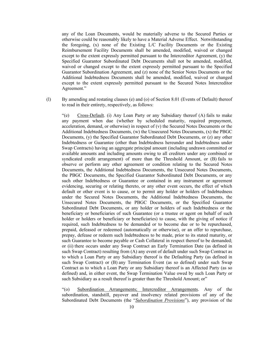 10 any of the Loan Documents, would be materially adverse to the Secured Parties or otherwise could be reasonably likely to have a Material Adverse Effect. Notwithstanding the foregoing, (x) none of the Existing L/C Facility Documents or the Existing Reimbursement Facility Documents shall be amended, modified, waived or changed except to the extent expressly permitted pursuant to the Intercreditor Agreement, (y) the Specified Guarantor Subordinated Debt Documents shall not be amended, modified, waived or changed except to the extent expressly permitted pursuant to the Specified Guarantor Subordination Agreement, and (z) none of the Senior Notes Documents or the Additional Indebtedness Documents shall be amended, modified, waived or changed except to the extent expressly permitted pursuant to the Secured Notes Intercreditor Agreement.” (l) By amending and restating clauses (e) and (o) of Section 8.01 (Events of Default) thereof to read in their entirety, respectively, as follows: “(e) Cross-Default. (i) Any Loan Party or any Subsidiary thereof (A) fails to make any payment when due (whether by scheduled maturity, required prepayment, acceleration, demand, or otherwise) in respect of (v) the Secured Notes Documents or the Additional Indebtedness Documents, (w) the Unsecured Notes Documents, (x) the PBGC Documents, (y) the Specified Guarantor Subordinated Debt Documents, or (z) any other Indebtedness or Guarantee (other than Indebtedness hereunder and Indebtedness under Swap Contracts) having an aggregate principal amount (including undrawn committed or available amounts and including amounts owing to all creditors under any combined or syndicated credit arrangement) of more than the Threshold Amount, or (B) fails to observe or perform any other agreement or condition relating to the Secured Notes Documents, the Additional Indebtedness Documents, the Unsecured Notes Documents, the PBGC Documents, the Specified Guarantor Subordinated Debt Documents, or any such other Indebtedness or Guarantee or contained in any instrument or agreement evidencing, securing or relating thereto, or any other event occurs, the effect of which default or other event is to cause, or to permit any holder or holders of Indebtedness under the Secured Notes Documents, the Additional Indebtedness Documents, the Unsecured Notes Documents, the PBGC Documents, or the Specified Guarantor Subordinated Debt Documents, or any holder or holders of such Indebtedness or the beneficiary or beneficiaries of such Guarantee (or a trustee or agent on behalf of such holder or holders or beneficiary or beneficiaries) to cause, with the giving of notice if required, such Indebtedness to be demanded or to become due or to be repurchased, prepaid, defeased or redeemed (automatically or otherwise), or an offer to repurchase, prepay, defease or redeem such Indebtedness to be made, prior to its stated maturity, or such Guarantee to become payable or Cash Collateral in respect thereof to be demanded; or (ii) there occurs under any Swap Contract an Early Termination Date (as defined in such Swap Contract) resulting from (A) any event of default under such Swap Contract as to which a Loan Party or any Subsidiary thereof is the Defaulting Party (as defined in such Swap Contract) or (B) any Termination Event (as so defined) under such Swap Contract as to which a Loan Party or any Subsidiary thereof is an Affected Party (as so defined) and, in either event, the Swap Termination Value owed by such Loan Party or such Subsidiary as a result thereof is greater than the Threshold Amount; or” “(o) Subordination Arrangements; Intercreditor Arrangements. Any of the subordination, standstill, payover and insolvency related provisions of any of the Subordinated Debt Documents (the “Subordination Provisions”), any provision of the