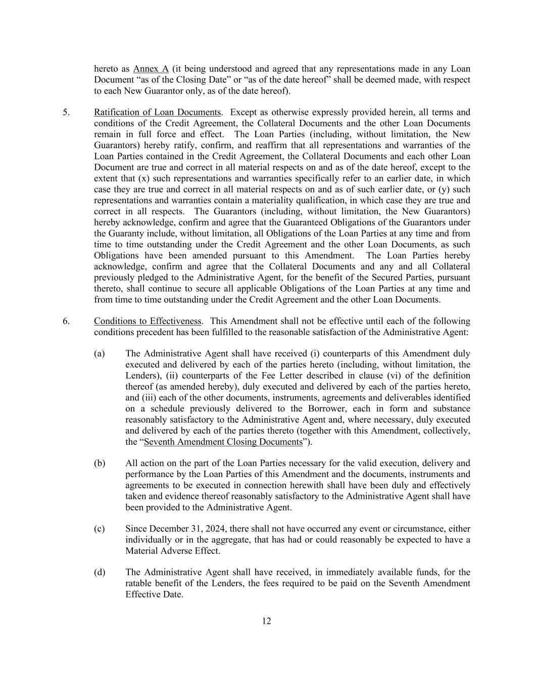 12 hereto as Annex A (it being understood and agreed that any representations made in any Loan Document “as of the Closing Date” or “as of the date hereof” shall be deemed made, with respect to each New Guarantor only, as of the date hereof). 5. Ratification of Loan Documents. Except as otherwise expressly provided herein, all terms and conditions of the Credit Agreement, the Collateral Documents and the other Loan Documents remain in full force and effect. The Loan Parties (including, without limitation, the New Guarantors) hereby ratify, confirm, and reaffirm that all representations and warranties of the Loan Parties contained in the Credit Agreement, the Collateral Documents and each other Loan Document are true and correct in all material respects on and as of the date hereof, except to the extent that (x) such representations and warranties specifically refer to an earlier date, in which case they are true and correct in all material respects on and as of such earlier date, or (y) such representations and warranties contain a materiality qualification, in which case they are true and correct in all respects. The Guarantors (including, without limitation, the New Guarantors) hereby acknowledge, confirm and agree that the Guaranteed Obligations of the Guarantors under the Guaranty include, without limitation, all Obligations of the Loan Parties at any time and from time to time outstanding under the Credit Agreement and the other Loan Documents, as such Obligations have been amended pursuant to this Amendment. The Loan Parties hereby acknowledge, confirm and agree that the Collateral Documents and any and all Collateral previously pledged to the Administrative Agent, for the benefit of the Secured Parties, pursuant thereto, shall continue to secure all applicable Obligations of the Loan Parties at any time and from time to time outstanding under the Credit Agreement and the other Loan Documents. 6. Conditions to Effectiveness. This Amendment shall not be effective until each of the following conditions precedent has been fulfilled to the reasonable satisfaction of the Administrative Agent: (a) The Administrative Agent shall have received (i) counterparts of this Amendment duly executed and delivered by each of the parties hereto (including, without limitation, the Lenders), (ii) counterparts of the Fee Letter described in clause (vi) of the definition thereof (as amended hereby), duly executed and delivered by each of the parties hereto, and (iii) each of the other documents, instruments, agreements and deliverables identified on a schedule previously delivered to the Borrower, each in form and substance reasonably satisfactory to the Administrative Agent and, where necessary, duly executed and delivered by each of the parties thereto (together with this Amendment, collectively, the “Seventh Amendment Closing Documents”). (b) All action on the part of the Loan Parties necessary for the valid execution, delivery and performance by the Loan Parties of this Amendment and the documents, instruments and agreements to be executed in connection herewith shall have been duly and effectively taken and evidence thereof reasonably satisfactory to the Administrative Agent shall have been provided to the Administrative Agent. (c) Since December 31, 2024, there shall not have occurred any event or circumstance, either individually or in the aggregate, that has had or could reasonably be expected to have a Material Adverse Effect. (d) The Administrative Agent shall have received, in immediately available funds, for the ratable benefit of the Lenders, the fees required to be paid on the Seventh Amendment Effective Date.