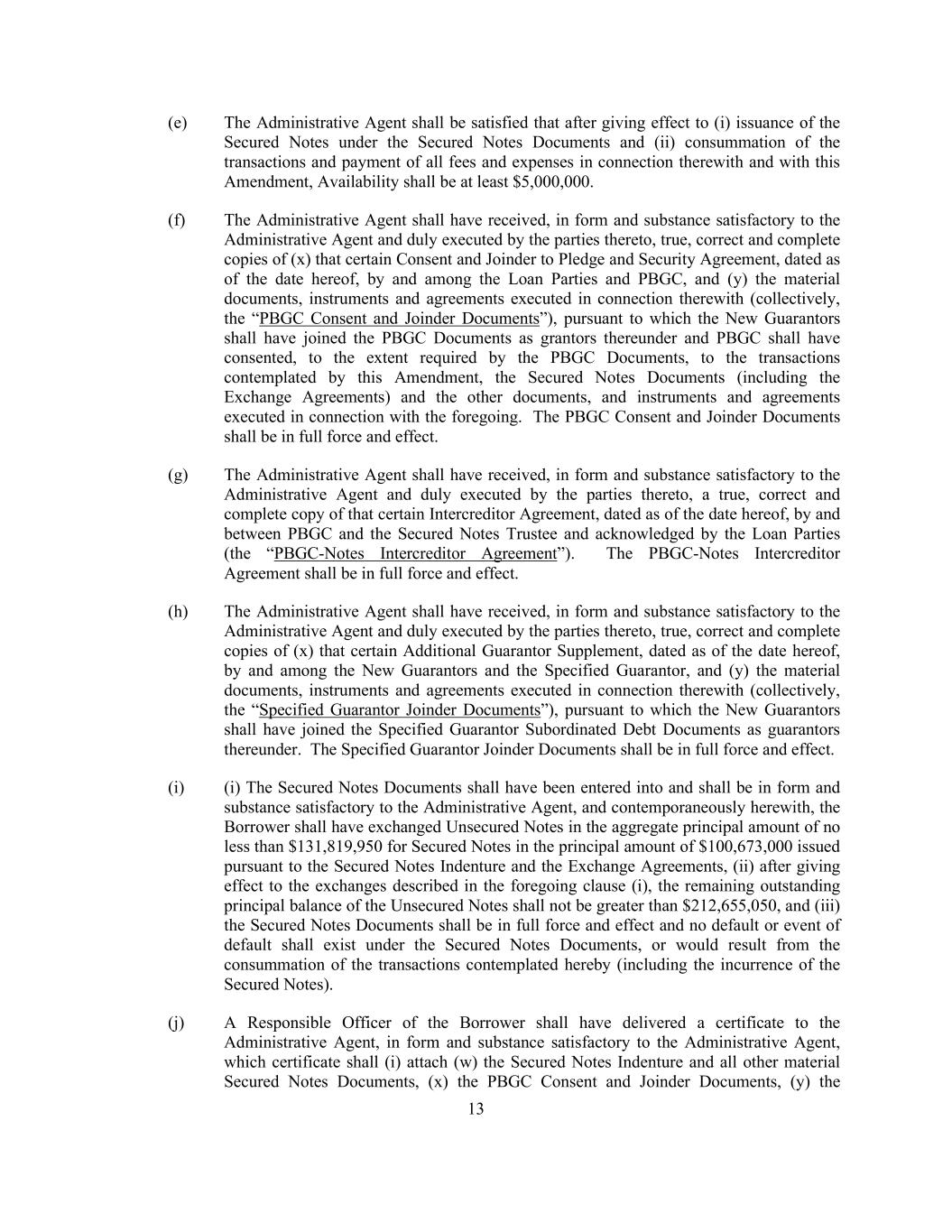 13 (e) The Administrative Agent shall be satisfied that after giving effect to (i) issuance of the Secured Notes under the Secured Notes Documents and (ii) consummation of the transactions and payment of all fees and expenses in connection therewith and with this Amendment, Availability shall be at least $5,000,000. (f) The Administrative Agent shall have received, in form and substance satisfactory to the Administrative Agent and duly executed by the parties thereto, true, correct and complete copies of (x) that certain Consent and Joinder to Pledge and Security Agreement, dated as of the date hereof, by and among the Loan Parties and PBGC, and (y) the material documents, instruments and agreements executed in connection therewith (collectively, the “PBGC Consent and Joinder Documents”), pursuant to which the New Guarantors shall have joined the PBGC Documents as grantors thereunder and PBGC shall have consented, to the extent required by the PBGC Documents, to the transactions contemplated by this Amendment, the Secured Notes Documents (including the Exchange Agreements) and the other documents, and instruments and agreements executed in connection with the foregoing. The PBGC Consent and Joinder Documents shall be in full force and effect. (g) The Administrative Agent shall have received, in form and substance satisfactory to the Administrative Agent and duly executed by the parties thereto, a true, correct and complete copy of that certain Intercreditor Agreement, dated as of the date hereof, by and between PBGC and the Secured Notes Trustee and acknowledged by the Loan Parties (the “PBGC-Notes Intercreditor Agreement”). The PBGC-Notes Intercreditor Agreement shall be in full force and effect. (h) The Administrative Agent shall have received, in form and substance satisfactory to the Administrative Agent and duly executed by the parties thereto, true, correct and complete copies of (x) that certain Additional Guarantor Supplement, dated as of the date hereof, by and among the New Guarantors and the Specified Guarantor, and (y) the material documents, instruments and agreements executed in connection therewith (collectively, the “Specified Guarantor Joinder Documents”), pursuant to which the New Guarantors shall have joined the Specified Guarantor Subordinated Debt Documents as guarantors thereunder. The Specified Guarantor Joinder Documents shall be in full force and effect. (i) (i) The Secured Notes Documents shall have been entered into and shall be in form and substance satisfactory to the Administrative Agent, and contemporaneously herewith, the Borrower shall have exchanged Unsecured Notes in the aggregate principal amount of no less than $131,819,950 for Secured Notes in the principal amount of $100,673,000 issued pursuant to the Secured Notes Indenture and the Exchange Agreements, (ii) after giving effect to the exchanges described in the foregoing clause (i), the remaining outstanding principal balance of the Unsecured Notes shall not be greater than $212,655,050, and (iii) the Secured Notes Documents shall be in full force and effect and no default or event of default shall exist under the Secured Notes Documents, or would result from the consummation of the transactions contemplated hereby (including the incurrence of the Secured Notes). (j) A Responsible Officer of the Borrower shall have delivered a certificate to the Administrative Agent, in form and substance satisfactory to the Administrative Agent, which certificate shall (i) attach (w) the Secured Notes Indenture and all other material Secured Notes Documents, (x) the PBGC Consent and Joinder Documents, (y) the
