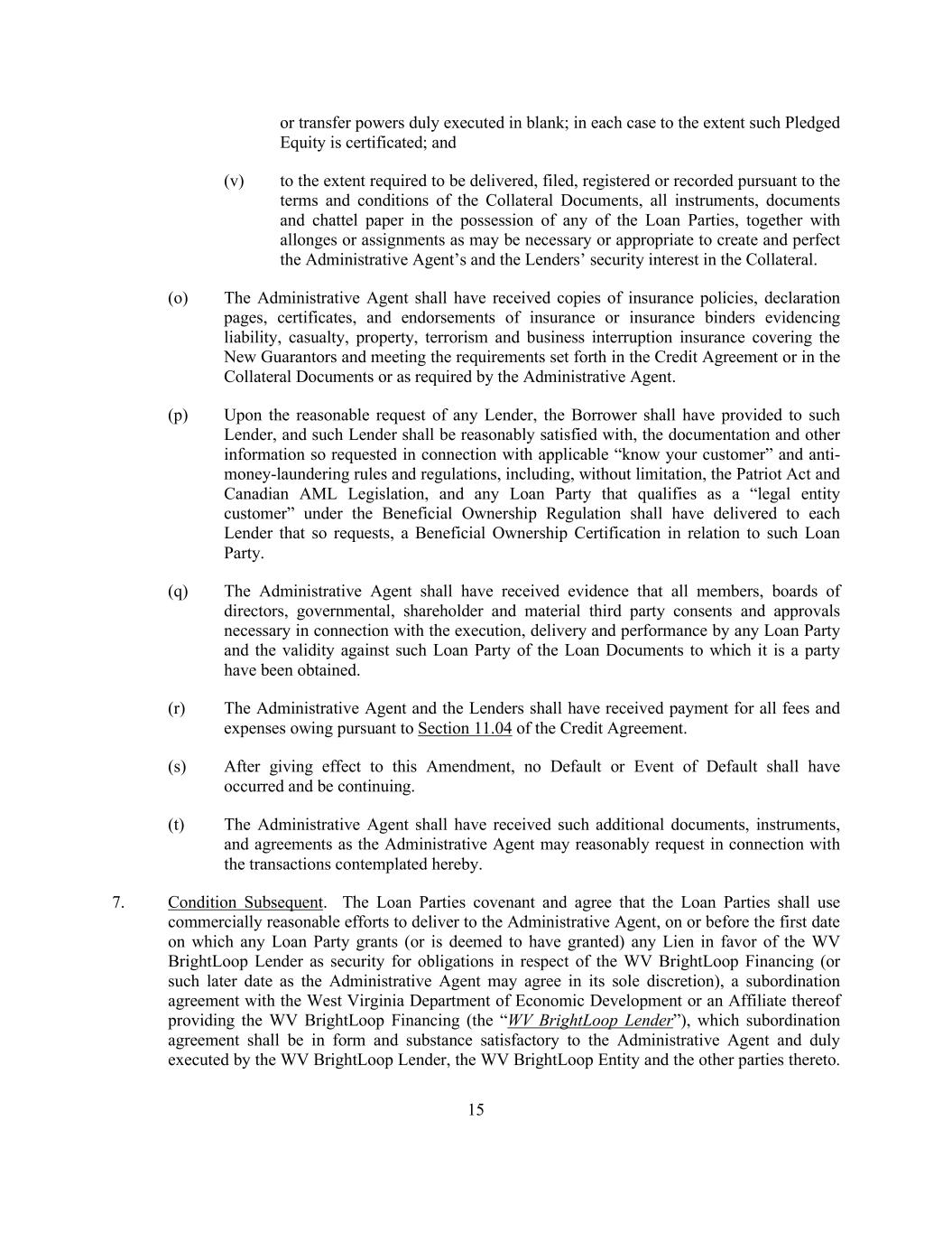 15 or transfer powers duly executed in blank; in each case to the extent such Pledged Equity is certificated; and (v) to the extent required to be delivered, filed, registered or recorded pursuant to the terms and conditions of the Collateral Documents, all instruments, documents and chattel paper in the possession of any of the Loan Parties, together with allonges or assignments as may be necessary or appropriate to create and perfect the Administrative Agent’s and the Lenders’ security interest in the Collateral. (o) The Administrative Agent shall have received copies of insurance policies, declaration pages, certificates, and endorsements of insurance or insurance binders evidencing liability, casualty, property, terrorism and business interruption insurance covering the New Guarantors and meeting the requirements set forth in the Credit Agreement or in the Collateral Documents or as required by the Administrative Agent. (p) Upon the reasonable request of any Lender, the Borrower shall have provided to such Lender, and such Lender shall be reasonably satisfied with, the documentation and other information so requested in connection with applicable “know your customer” and anti- money-laundering rules and regulations, including, without limitation, the Patriot Act and Canadian AML Legislation, and any Loan Party that qualifies as a “legal entity customer” under the Beneficial Ownership Regulation shall have delivered to each Lender that so requests, a Beneficial Ownership Certification in relation to such Loan Party. (q) The Administrative Agent shall have received evidence that all members, boards of directors, governmental, shareholder and material third party consents and approvals necessary in connection with the execution, delivery and performance by any Loan Party and the validity against such Loan Party of the Loan Documents to which it is a party have been obtained. (r) The Administrative Agent and the Lenders shall have received payment for all fees and expenses owing pursuant to Section 11.04 of the Credit Agreement. (s) After giving effect to this Amendment, no Default or Event of Default shall have occurred and be continuing. (t) The Administrative Agent shall have received such additional documents, instruments, and agreements as the Administrative Agent may reasonably request in connection with the transactions contemplated hereby. 7. Condition Subsequent. The Loan Parties covenant and agree that the Loan Parties shall use commercially reasonable efforts to deliver to the Administrative Agent, on or before the first date on which any Loan Party grants (or is deemed to have granted) any Lien in favor of the WV BrightLoop Lender as security for obligations in respect of the WV BrightLoop Financing (or such later date as the Administrative Agent may agree in its sole discretion), a subordination agreement with the West Virginia Department of Economic Development or an Affiliate thereof providing the WV BrightLoop Financing (the “WV BrightLoop Lender”), which subordination agreement shall be in form and substance satisfactory to the Administrative Agent and duly executed by the WV BrightLoop Lender, the WV BrightLoop Entity and the other parties thereto.