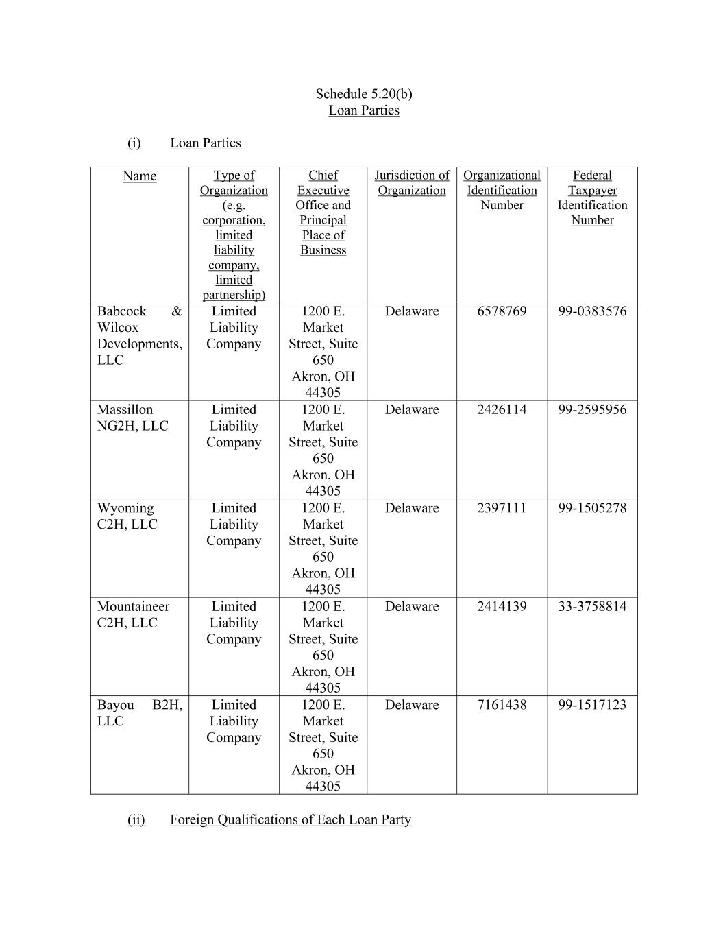 Schedule 5.20(b) Loan Parties (i) Loan Parties Name Type of Organization (e.g. corporation, limited liability company, limited partnership) Chief Executive Office and Principal Place of Business Jurisdiction of Organization Organizational Identification Number Federal Taxpayer Identification Number Babcock & Wilcox Developments, LLC Limited Liability Company 1200 E. Market Street, Suite 650 Akron, OH 44305 Delaware 6578769 99-0383576 Massillon NG2H, LLC Limited Liability Company 1200 E. Market Street, Suite 650 Akron, OH 44305 Delaware 2426114 99-2595956 Wyoming C2H, LLC Limited Liability Company 1200 E. Market Street, Suite 650 Akron, OH 44305 Delaware 2397111 99-1505278 Mountaineer C2H, LLC Limited Liability Company 1200 E. Market Street, Suite 650 Akron, OH 44305 Delaware 2414139 33-3758814 Bayou B2H, LLC Limited Liability Company 1200 E. Market Street, Suite 650 Akron, OH 44305 Delaware 7161438 99-1517123 (ii) Foreign Qualifications of Each Loan Party
