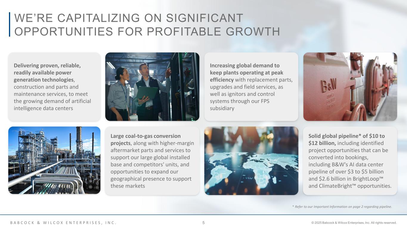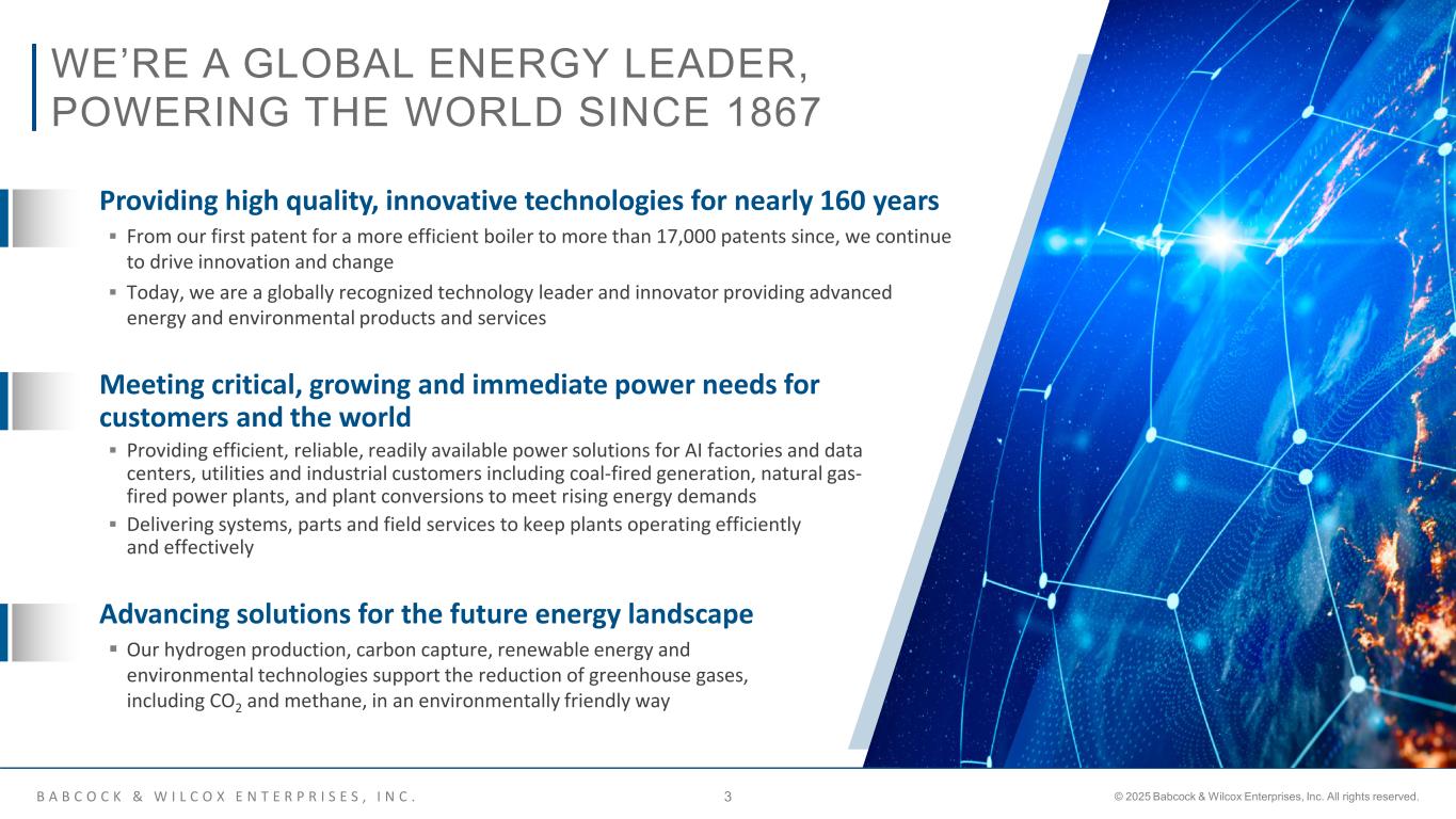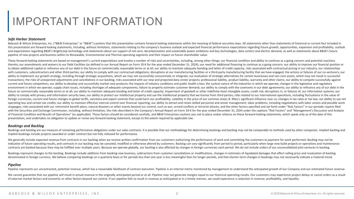 B A B C O C K & W I L C O X E N T E R P R I S E S , I N C . © 2025 Babcock & Wilcox Enterprises, Inc. All rights reserved.2 IMPORTANT INFORMATION Safe Harbor Statement Babcock & Wilcox Enterprises, Inc. (“B&W Enterprises” or “B&W”) cautions that this presentation contains forward-looking statements within the meaning of federal securities laws. All statements other than statements of historical or current fact included in this presentation are forward-looking statements, including, without limitation, statements relating to the company's business outlook and expected financial performance expectations regarding future growth, opportunities, expansion and profitability, outlook and expectations regarding B&W’s BrightLoop technology and statements about our support of net-zero, decarbonization and sustainable power ambitions and key technologies, data centers and electric demand, as well as statements about B&W’s future pipeline of new projects and business within its Renewable, Environmental and Thermal operating segments and their impact on future shareholder value. These forward-looking statements are based on management’s current expectations and involve a number of risks and uncertainties, including, among other things: our financial condition and ability to continue as a going concern and potential reactions thereto; our amendments and waivers to our Debt Facilities (as defined in our Annual Report on Form 10-K for the year ended December 31, 2024); our need for additional financing to continue as a going concern; our ability to improve our financial position or to obtain additional capital or refinance any of our debt in the future on commercially reasonable terms or at all; our ability to maintain adequate bonding and letter of credit capacity; risks associated with contractual pricing in our industry; our relationships with customers, subcontractors and other third parties; our ability to comply with our contractual obligations; disruptions at our manufacturing facilities or a third-party manufacturing facility that we have engaged; the actions or failures of our co-venturers; our ability to implement our growth strategy, including through strategic acquisitions, which we may not successfully consummate or integrate; our evaluation of strategic alternatives for certain businesses and non-core assets, which may not result in successful transactions; the risks of unexpected adjustments and cancellations in our backlog; risks associated with our new and projected data center projects; professional liability, product liability, warranty and other claims; our ability to compete successfully against current and future competitors; our ability to develop and successfully market new products; the impacts of industry conditions and public health crises; the cyclical nature of the industries in which we operate; changes in the legislative and regulatory environment in which we operate; supply chain issues, including shortages of adequate components; failure to properly estimate customer demand; our ability to comply with the covenants in our debt agreements; our ability to refinance any of our debt in the future on commercially reasonable terms or at all; our ability to maintain adequate bonding and letter of credit capacity; impairment of goodwill or other indefinite-lived intangible assets; credit risk; disruptions in, or failures of, our information systems; our ability to comply with privacy and information security laws; our ability to protect our intellectual property and use the intellectual property that we license from third parties; risks related to our international operations, including fluctuations in the value of foreign currencies, current and future changes to global tariffs, sanctions and export controls that could harm our profitability; volatility in the price of our common stock; B. Riley’s significant influence over us; changes in tax rates or tax law; our ability to use net operating loss and certain tax credits; our ability to maintain effective internal control over financial reporting; our ability to attract and retain skilled personnel and senior management; labor problems, including negotiations with labor unions and possible work stoppages; risks associated with our retirement benefit plans; natural disasters or other events beyond our control, such as war, armed conflicts or terrorist attacks; and the other factors specified and set forth under "Risk Factors" in our periodic reports filed with the Securities and Exchange Commission, including, without limitation, the risks described in the Company's Annual Report on Form 10-K for the year ended December 31, 2024 under the captions "Risk Factors" and "Management's Discussion and Analysis of Financial Condition and Results of Operations" (as applicable). These factors should be considered carefully, and B&W Enterprises cautions you not to place undue reliance on these forward-looking statements, which speak only as of the date of this presentation, and undertakes no obligation to update or revise any forward-looking statement, except to the extent required by applicable law. Bookings and Backlog Bookings and backlog are our measure of remaining performance obligations under our sales contracts. It is possible that our methodology for determining bookings and backlog may not be comparable to methods used by other companies. Implied backlog and implied bookings include projects awarded or under contract but not fully released for performance. We generally include expected revenue from contracts in our backlog when we receive written confirmation from our customers authorizing the performance of work and committing the customers to payment for work performed. Backlog may not be indicative of future operating results, and contracts in our backlog may be canceled, modified or otherwise altered by customers. Backlog can vary significantly from period to period, particularly when large new build projects