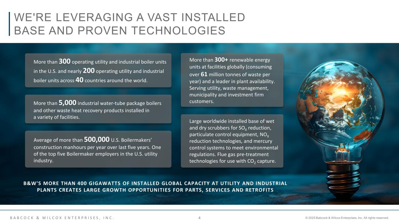 B A B C O C K & W I L C O X E N T E R P R I S E S , I N C . © 2025 Babcock & Wilcox Enterprises, Inc. All rights reserved.3 Providing high quality, innovative technologies for nearly 160 years From our first patent for a more efficient boiler to more than 17,000 patents since, we continue to drive innovation and change Today, we are a globally recognized technology leader and innovator providing advanced energy and environmental products and services WE’RE A GLOBAL ENERGY LEADER, POWERING THE WORLD SINCE 1867 Advancing solutions for the future energy landscape Our hydrogen production, carbon capture, renewable energy and environmental technologies support the reduction of greenhouse gases, including CO2 and methane, in an environmentally friendly way Meeting critical, growing and immediate power needs for customers and the world Providing efficient, reliable, readily available power solutions for AI factories and data centers, utilities and industrial customers including coal-fired generation, natural gas- fired power plants, and plant conversions to meet rising energy demands Delivering systems, parts and field services to keep plants operating efficiently and effectively