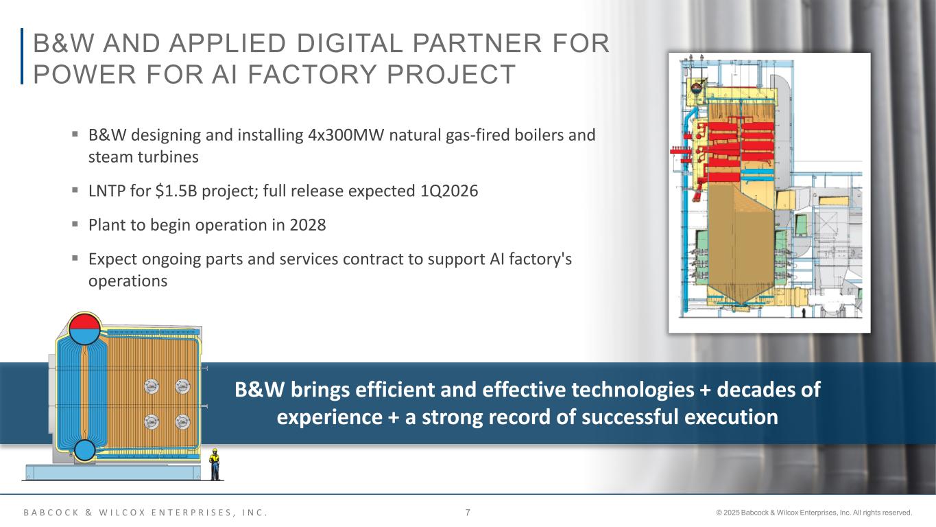 B A B C O C K & W I L C O X E N T E R P R I S E S , I N C . © 2025 Babcock & Wilcox Enterprises, Inc. All rights reserved.6 Electric Demand Forecast Soaring • Total data center demand expected to be 176GW by 2035; up from 33GW in 2024 Primary U.S. Data Center Buyers • Artificial Intelligence infrastructure consortiums • Hyperscaler cloud providers • Private equity and investment firms Key B&W Developments for this Growing Market • Strategic Partnership with Denham Capital to convert existing coal plants to power data centers in U.S. and Europe • Limited notice to proceed on $1.5 billion project to deliver one gigawatt of power for Applied Digital AI Factory; full notice to proceed expected January 2026. Smart, Fast-Track B&W Solutions for AI Factories and Data Centers • Off-the-shelf 300 MW natural gas-fired boiler and steam turbine designs • Provides fast, efficient, readily available, redundant power • Modular, field-erected and scalable with accelerated startup • On-site or co-located power supply to eliminate grid issues AI FACTORIES AND DATA CENTERS: RISING POWER DEMAND AND OPPORTUNITIES Capital expenditure is expected to exceed $1 trillion within the next five years for electric and gas utilities, and also reach $1 trillion within the next three years for data centers * https://www.deloitte.com/us/en/insights/industry/power-and-utilities/data-center-infrastructure-artificial-intelligence.html