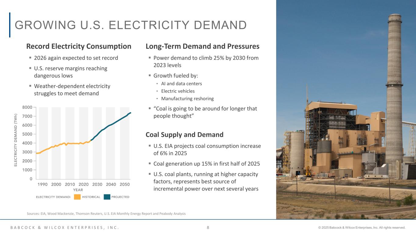 B A B C O C K & W I L C O X E N T E R P R I S E S , I N C . © 2025 Babcock & Wilcox Enterprises, Inc. All rights reserved.7 B&W AND APPLIED DIGITAL PARTNER FOR POWER FOR AI FACTORY PROJECT B&W designing and installing 4x300MW natural gas-fired boilers and steam turbines LNTP for $1.5B project; full release expected 1Q2026 Plant to begin operation in 2028 Expect ongoing parts and services contract to support AI factory's operations B&W brings efficient and effective technologies + decades of experience + a strong record of successful execution