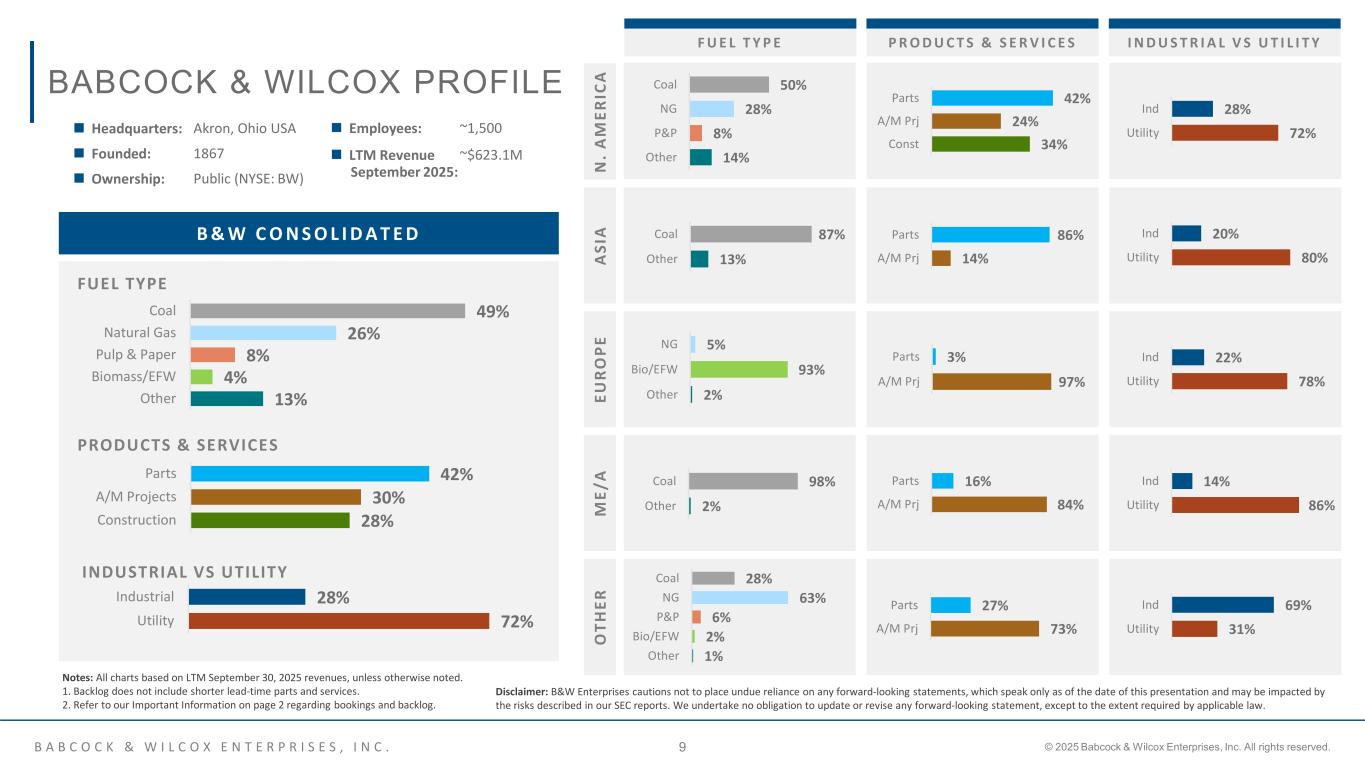 B A B C O C K & W I L C O X E N T E R P R I S E S , I N C . © 2025 Babcock & Wilcox Enterprises, Inc. All rights reserved.9 BABCOCK & WILCOX PROFILE Employees: ~1,500 LTM Revenue September 2025: ~$623.1M Headquarters: Akron, Ohio USA Founded: 1867 Ownership: Public (NYSE: BW) N . A M ER IC A F U E L T Y P E P R O D U C T S & S E R V I C E S I N D U S T R I A L V S U T I L I T Y 34% 24% 42% Const A/M Prj Parts 72% 28% Utility Ind A SI A EU R O PE M E/ A O TH ER 14% 8% 28% 50% Other P&P NG Coal 14% 86% A/M Prj Parts 80% 20% Utility Ind 13% 87% Other Coal 97% 3% A/M Prj Parts 78% 22% Utility Ind 2% 93% 5% Other Bio/EFW NG 86% 14% Utility Ind 2% 98% Other Coal 31% 69% Utility Ind 1% 2% 6% 63% 28% Other Bio/EFW P&P NG Coal Disclaimer: B&W Enterprises cautions not to place undue reliance on any forward-looking statements, which speak only as of the date of this presentation and may be impacted by the risks described in our SEC reports. We undertake no obligation to update or revise any forward-looking statement, except to the extent required by applicable law. 84% 16% A/M Prj Parts 73% 27% A/M Prj Parts 72% 28% Utility Industrial 13% 4% 8% 26% 49% Other Biomass/EFW Pulp & Paper Natural Gas Coal FUEL TYPE B & W C O N S O L I D A T E D 28% 30% 42% Construction A/M Projects Parts PRODUCTS & SERVICES INDUSTRIAL VS UTILITY Notes: All charts based on LTM September 30, 2025 revenues, unless otherwise noted. 1. Backlog does not include shorter lead-time parts and services. 2. Refer to our Important Information on page 2 regarding bookings and backlog.