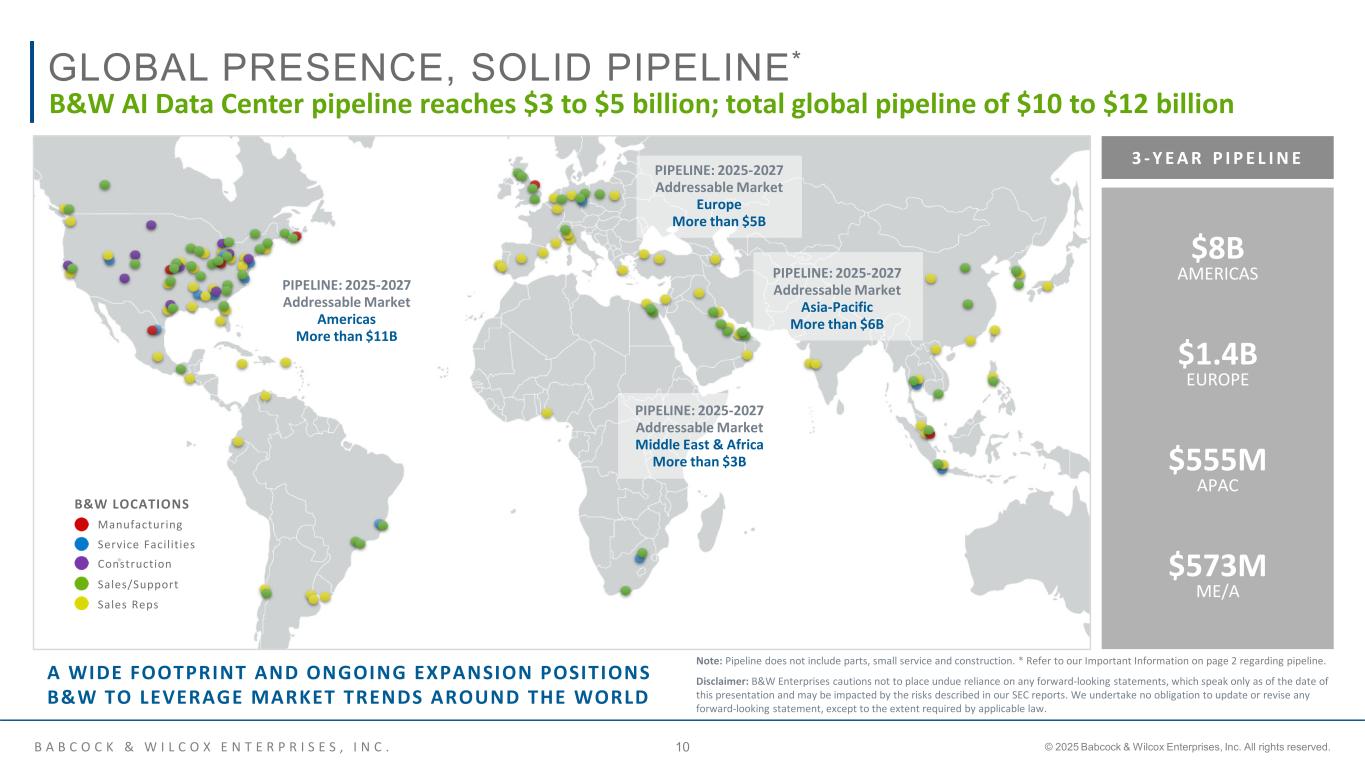 B A B C O C K & W I L C O X E N T E R P R I S E S , I N C . © 2025 Babcock & Wilcox Enterprises, Inc. All rights reserved.10 GLOBAL PRESENCE, SOLID PIPELINE* Manufacturing Service Facilities Construction Sales/Support Sales Reps B&W AI Data Center pipeline reaches $3 to $5 billion; total global pipeline of $10 to $12 billion PIPELINE: 2025-2027 Addressable Market Europe More than $5B PIPELINE: 2025-2027 Addressable Market Americas More than $11B PIPELINE: 2025-2027 Addressable Market Asia-Pacific More than $6B PIPELINE: 2025-2027 Addressable Market Middle East & Africa More than $3B 3 - Y E A R P I P E L I N E B&W LOCATIONS $8B AMERICAS $1.4B EUROPE $573M ME/A $555M APAC Note: Pipeline does not include parts, small service and construction. * Refer to our Important Information on page 2 regarding pipeline. Disclaimer: B&W Enterprises cautions not to place undue reliance on any forward-looking statements, which speak only as of the date of this presentation and may be impacted by the risks described in our SEC reports. We undertake no obligation to update or revise any forward-looking statement, except to the extent required by applicable law. A WIDE FOOTPRINT AND ONGOING EXPANSION POSITIONS B&W TO LEVERAGE MARKET TRENDS AROUND THE WORLD
