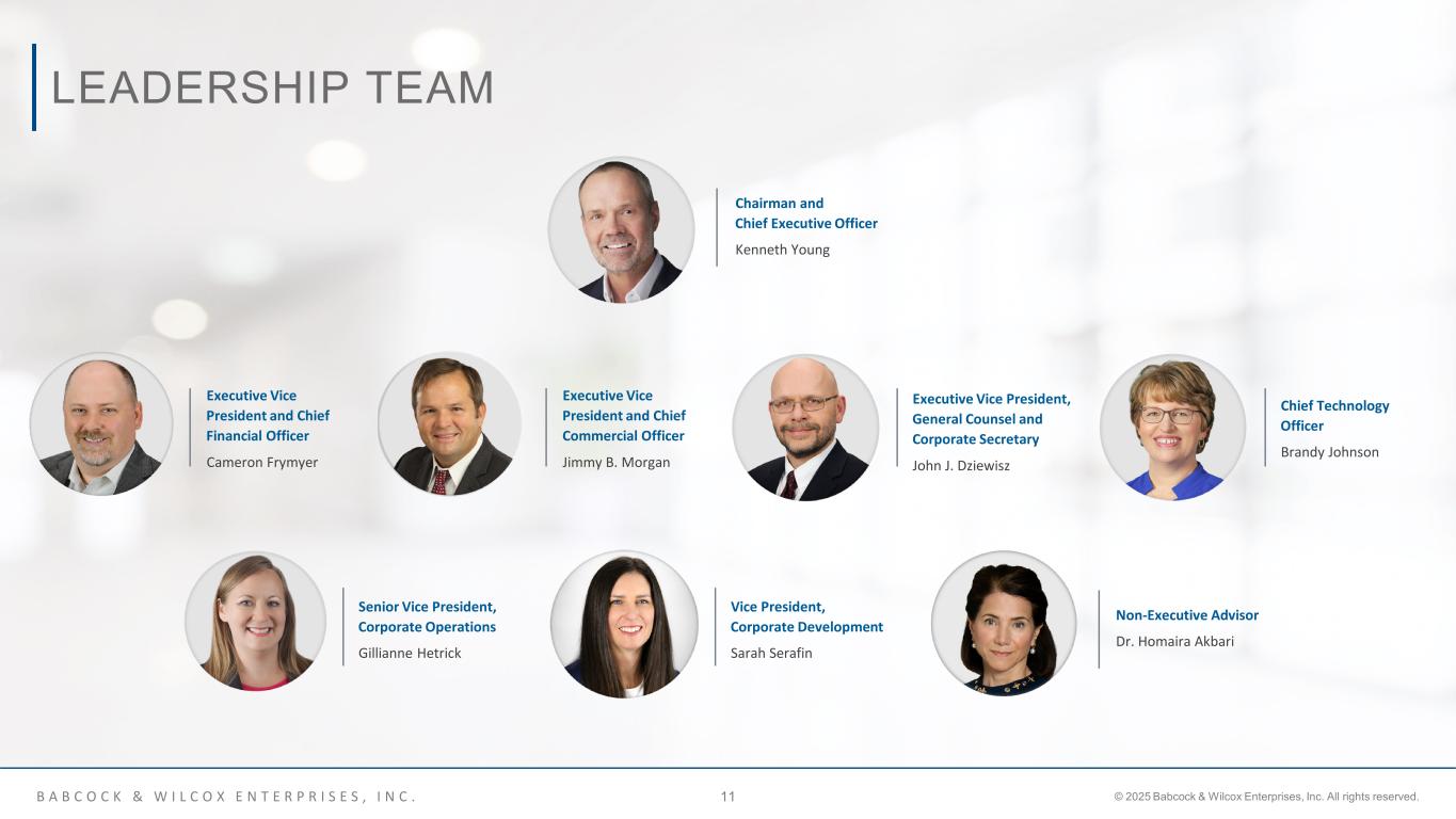 B A B C O C K & W I L C O X E N T E R P R I S E S , I N C . © 2025 Babcock & Wilcox Enterprises, Inc. All rights reserved.11 LEADERSHIP TEAM Executive Vice President and Chief Financial Officer Cameron Frymyer Executive Vice President, General Counsel and Corporate Secretary John J. Dziewisz Chief Technology Officer Brandy Johnson Chairman and Chief Executive Officer Kenneth Young Executive Vice President and Chief Commercial Officer Jimmy B. Morgan Senior Vice President, Corporate Operations Gillianne Hetrick Vice President, Corporate Development Sarah Serafin Non-Executive Advisor Dr. Homaira Akbari