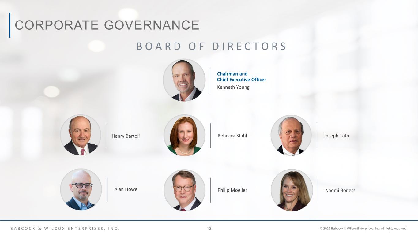 B A B C O C K & W I L C O X E N T E R P R I S E S , I N C . © 2025 Babcock & Wilcox Enterprises, Inc. All rights reserved.12 CORPORATE GOVERNANCE B O A R D O F D I R E C T O R S Chairman and Chief Executive Officer Kenneth Young Joseph TatoRebecca StahlHenry Bartoli Alan Howe Philip Moeller Naomi Boness