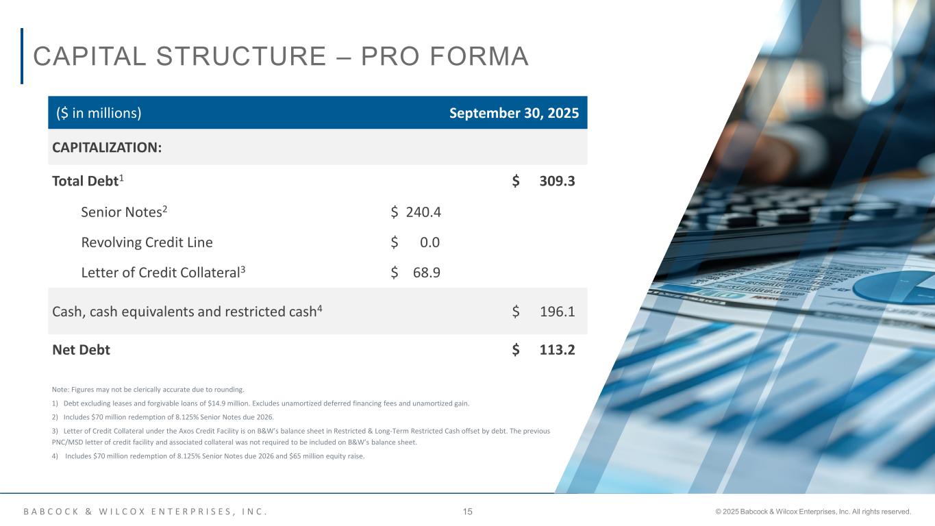 B A B C O C K & W I L C O X E N T E R P R I S E S , I N C . © 2025 Babcock & Wilcox Enterprises, Inc. All rights reserved.15 CAPITAL STRUCTURE – PRO FORMA ($ in millions) September 30, 2025 CAPITALIZATION: Total Debt1 $ 309.3 Senior Notes2 $ 240.4 Revolving Credit Line $ 0.0 Letter of Credit Collateral3 $ 68.9 Cash, cash equivalents and restricted cash4 $ 196.1 Net Debt $ 113.2 Note: Figures may not be clerically accurate due to rounding. 1) Debt excluding leases and forgivable loans of $14.9 million. Excludes unamortized deferred financing fees and unamortized gain. 2) Includes $70 million redemption of 8.125% Senior Notes due 2026. 3) Letter of Credit Collateral under the Axos Credit Facility is on B&W’s balance sheet in Restricted & Long-Term Restricted Cash offset by debt. The previous PNC/MSD letter of credit facility and associated collateral was not required to be included on B&W’s balance sheet. 4) Includes $70 million redemption of 8.125% Senior Notes due 2026 and $65 million equity raise.