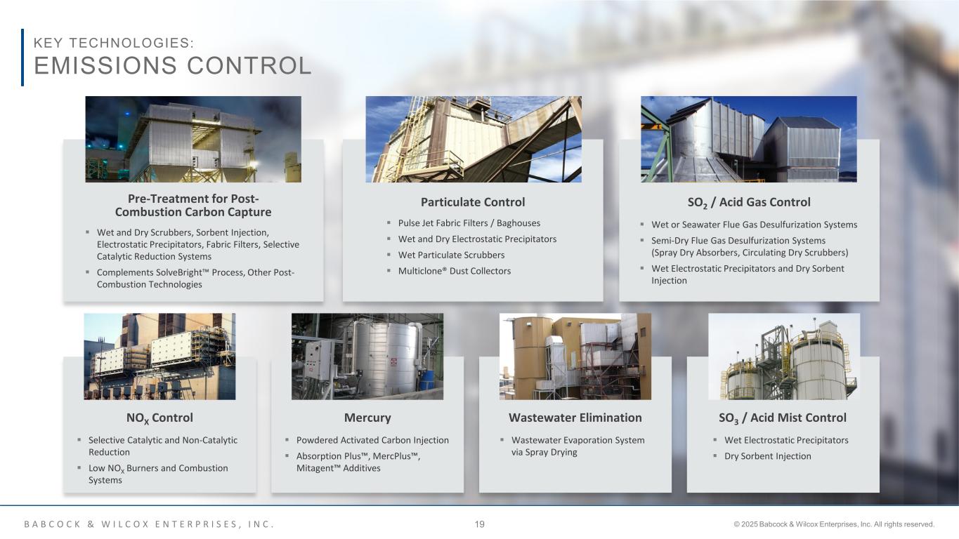 B A B C O C K & W I L C O X E N T E R P R I S E S , I N C . © 2025 Babcock & Wilcox Enterprises, Inc. All rights reserved.19 KEY TECHNOLOGIES: EMISSIONS CONTROL Pre-Treatment for Post- Combustion Carbon Capture Wet and Dry Scrubbers, Sorbent Injection, Electrostatic Precipitators, Fabric Filters, Selective Catalytic Reduction Systems Complements SolveBright Process, Other Post- Combustion Technologies Particulate Control Pulse Jet Fabric Filters / Baghouses Wet and Dry Electrostatic Precipitators Wet Particulate Scrubbers Multiclone® Dust Collectors NOX Control Selective Catalytic and Non-Catalytic Reduction Low NOX Burners and Combustion Systems SO2 / Acid Gas Control Wet or Seawater Flue Gas Desulfurization Systems Semi-Dry Flue Gas Desulfurization Systems (Spray Dry Absorbers, Circulating Dry Scrubbers) Wet Electrostatic Precipitators and Dry Sorbent Injection SO3 / Acid Mist Control Wet Electrostatic Precipitators Dry Sorbent Injection Mercury Powdered Activated Carbon Injection Absorption Plus , MercPlus , Mitagent Additives Wastewater Elimination Wastewater Evaporation System via Spray Drying
