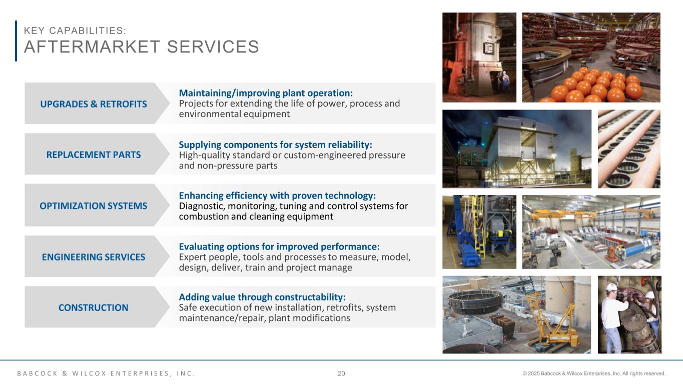B A B C O C K & W I L C O X E N T E R P R I S E S , I N C . © 2025 Babcock & Wilcox Enterprises, Inc. All rights reserved.20 KEY CAPABILITIES: AFTERMARKET SERVICES Adding value through constructability: Safe execution of new installation, retrofits, system maintenance/repair, plant modifications CONSTRUCTION OPTIMIZATION SYSTEMS Enhancing efficiency with proven technology: Diagnostic, monitoring, tuning and control systems for combustion and cleaning equipment UPGRADES & RETROFITS Maintaining/improving plant operation: Projects for extending the life of power, process and environmental equipment ENGINEERING SERVICES Evaluating options for improved performance: Expert people, tools and processes to measure, model, design, deliver, train and project manage REPLACEMENT PARTS Supplying components for system reliability: High-quality standard or custom-engineered pressure and non-pressure parts