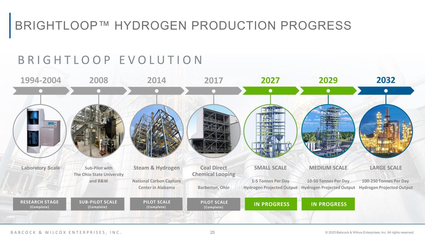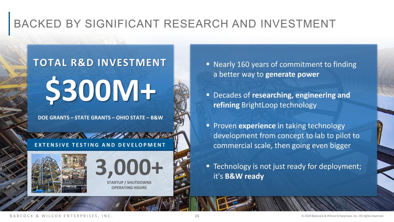 B A B C O C K & W I L C O X E N T E R P R I S E S , I N C . © 2025 Babcock & Wilcox Enterprises, Inc. All rights reserved.24 $300M+ TOTAL R&D INVESTMENT DOE GRANTS – STATE GRANTS – OHIO STATE – B&W E X T E N S I V E T E S T I N G A N D D E V E L O P M E N T STARTUP / SHUTDOWNS OPERATING HOURS 3,000+ Nearly 160 years of commitment to finding a better way to generate power Decades of researching, engineering and refining BrightLoop technology Proven experience in taking technology development from concept to lab to pilot to commercial scale, then going even bigger Technology is not just ready for deployment; it's B&W ready BACKED BY SIGNIFICANT RESEARCH AND INVESTMENT