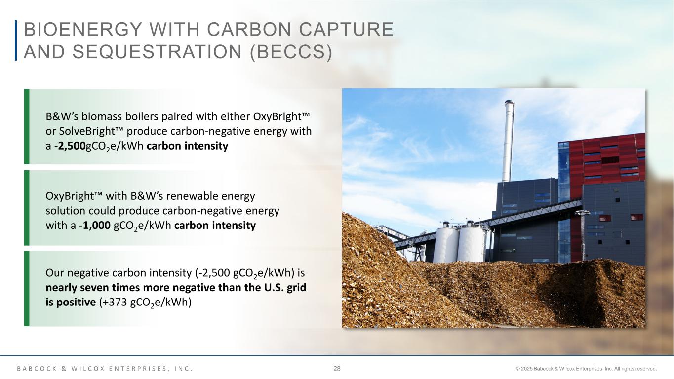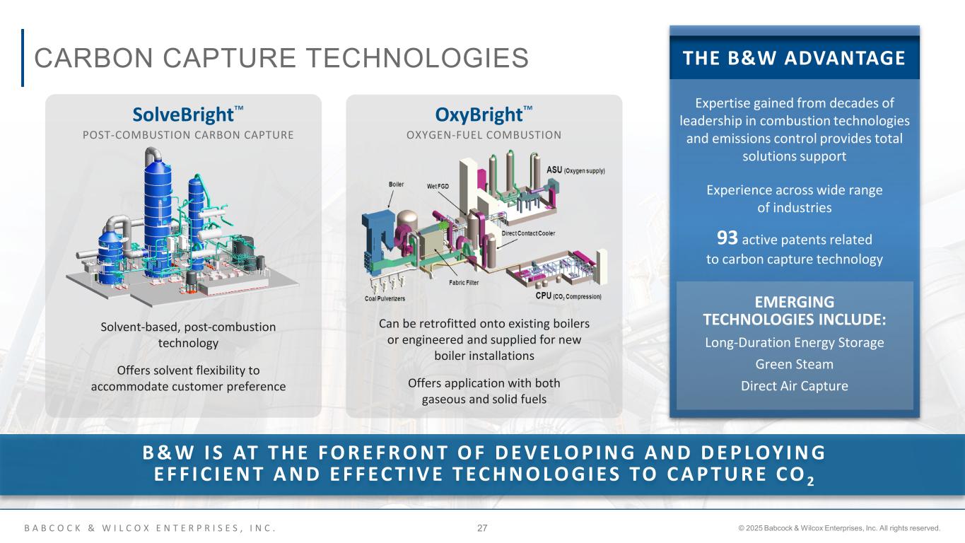 B A B C O C K & W I L C O X E N T E R P R I S E S , I N C . © 2025 Babcock & Wilcox Enterprises, Inc. All rights reserved.27 CARBON CAPTURE TECHNOLOGIES B & W I S AT T H E F O R E F R O N T O F D E V E LO P I N G A N D D E P LOY I N G E F F I C I E N T A N D E F F E C T I V E T E C H N O LO G I E S TO C A P T U R E C O 2 OxyBright OXYGEN-FUEL COMBUSTION SolveBright POST-COMBUSTION CARBON CAPTURE Solvent-based, post-combustion technology Offers solvent flexibility to accommodate customer preference Can be retrofitted onto existing boilers or engineered and supplied for new boiler installations Offers application with both gaseous and solid fuels THE B&W ADVANTAGE Expertise gained from decades of leadership in combustion technologies and emissions control provides total solutions support Experience across wide range of industries 93 active patents related to carbon capture technology EMERGING TECHNOLOGIES INCLUDE: Long-Duration Energy Storage Green Steam Direct Air Capture