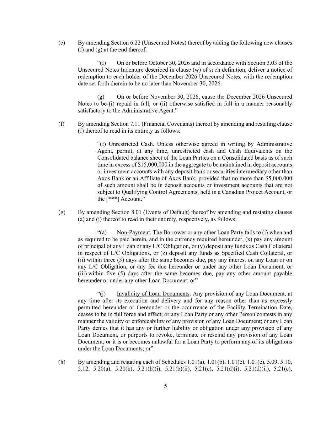 5 (e) By amending Section 6.22 (Unsecured Notes) thereof by adding the following new clauses (f) and (g) at the end thereof: “(f) On or before October 30, 2026 and in accordance with Section 3.03 of the Unsecured Notes Indenture described in clause (w) of such definition, deliver a notice of redemption to each holder of the December 2026 Unsecured Notes, with the redemption date set forth therein to be no later than November 30, 2026. (g) On or before November 30, 2026, cause the December 2026 Unsecured Notes to be (i) repaid in full, or (ii) otherwise satisfied in full in a manner reasonably satisfactory to the Administrative Agent.” (f) By amending Section 7.11 (Financial Covenants) thereof by amending and restating clause (f) thereof to read in its entirety as follows: “(f) Unrestricted Cash. Unless otherwise agreed in writing by Administrative Agent, permit, at any time, unrestricted cash and Cash Equivalents on the Consolidated balance sheet of the Loan Parties on a Consolidated basis as of such time in excess of $15,000,000 in the aggregate to be maintained in deposit accounts or investment accounts with any deposit bank or securities intermediary other than Axos Bank or an Affiliate of Axos Bank; provided that no more than $5,000,000 of such amount shall be in deposit accounts or investment accounts that are not subject to Qualifying Control Agreements, held in a Canadian Project Account, or the [***] Account.” (g) By amending Section 8.01 (Events of Default) thereof by amending and restating clauses (a) and (j) thereof to read in their entirety, respectively, as follows: “(a) Non-Payment. The Borrower or any other Loan Party fails to (i) when and as required to be paid herein, and in the currency required hereunder, (x) pay any amount of principal of any Loan or any L/C Obligation, or (y) deposit any funds as Cash Collateral in respect of L/C Obligations, or (z) deposit any funds as Specified Cash Collateral, or (ii) within three (3) days after the same becomes due, pay any interest on any Loan or on any L/C Obligation, or any fee due hereunder or under any other Loan Document, or (iii) within five (5) days after the same becomes due, pay any other amount payable hereunder or under any other Loan Document; or” “(j) Invalidity of Loan Documents. Any provision of any Loan Document, at any time after its execution and delivery and for any reason other than as expressly permitted hereunder or thereunder or the occurrence of the Facility Termination Date, ceases to be in full force and effect; or any Loan Party or any other Person contests in any manner the validity or enforceability of any provision of any Loan Document; or any Loan Party denies that it has any or further liability or obligation under any provision of any Loan Document, or purports to revoke, terminate or rescind any provision of any Loan Document; or it is or becomes unlawful for a Loan Party to perform any of its obligations under the Loan Documents; or” (h) By amending and restating each of Schedules 1.01(a), 1.01(b), 1.01(c), 1.01(e), 5.09, 5.10, 5.12, 5.20(a), 5.20(b), 5.21(b)(i), 5.21(b)(ii), 5.21(c), 5.21(d)(i), 5.21(d)(ii), 5.21(e),