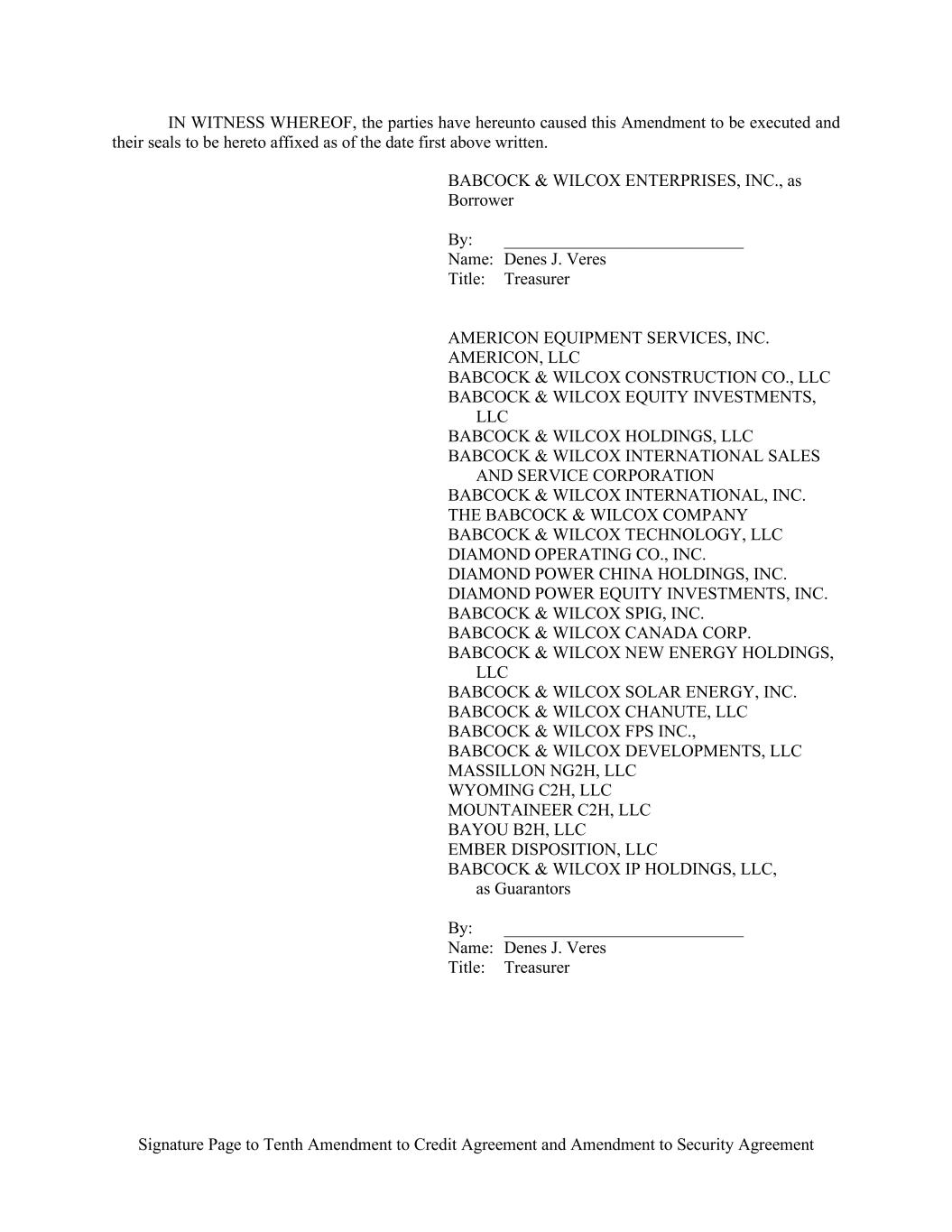 Signature Page to Tenth Amendment to Credit Agreement and Amendment to Security Agreement IN WITNESS WHEREOF, the parties have hereunto caused this Amendment to be executed and their seals to be hereto affixed as of the date first above written. BABCOCK & WILCOX ENTERPRISES, INC., as Borrower By: ____________________________ Name: Denes J. Veres Title: Treasurer AMERICON EQUIPMENT SERVICES, INC. AMERICON, LLC BABCOCK & WILCOX CONSTRUCTION CO., LLC BABCOCK & WILCOX EQUITY INVESTMENTS, LLC BABCOCK & WILCOX HOLDINGS, LLC BABCOCK & WILCOX INTERNATIONAL SALES AND SERVICE CORPORATION BABCOCK & WILCOX INTERNATIONAL, INC. THE BABCOCK & WILCOX COMPANY BABCOCK & WILCOX TECHNOLOGY, LLC DIAMOND OPERATING CO., INC. DIAMOND POWER CHINA HOLDINGS, INC. DIAMOND POWER EQUITY INVESTMENTS, INC. BABCOCK & WILCOX SPIG, INC. BABCOCK & WILCOX CANADA CORP. BABCOCK & WILCOX NEW ENERGY HOLDINGS, LLC BABCOCK & WILCOX SOLAR ENERGY, INC. BABCOCK & WILCOX CHANUTE, LLC BABCOCK & WILCOX FPS INC., BABCOCK & WILCOX DEVELOPMENTS, LLC MASSILLON NG2H, LLC WYOMING C2H, LLC MOUNTAINEER C2H, LLC BAYOU B2H, LLC EMBER DISPOSITION, LLC BABCOCK & WILCOX IP HOLDINGS, LLC, as Guarantors By: ____________________________ Name: Denes J. Veres Title: Treasurer